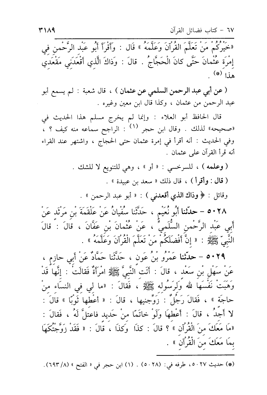 «خَيْرُكُمْ مَنْ تَعَلَّمَ القُرْآنَ وَعَلَّمَهُ»، قَالَ: وَأَقْرَأَ أَبُو عَبْدِ الرَّحْمَنِ فِي إِمْرَةِ عُثْمَانَ، حَتَّى كَانَ الحَجَّاجُ قَالَ: وَذَاكَ الَّذِي أَقْعَدَنِي مَقْعَدِي هَذَا.