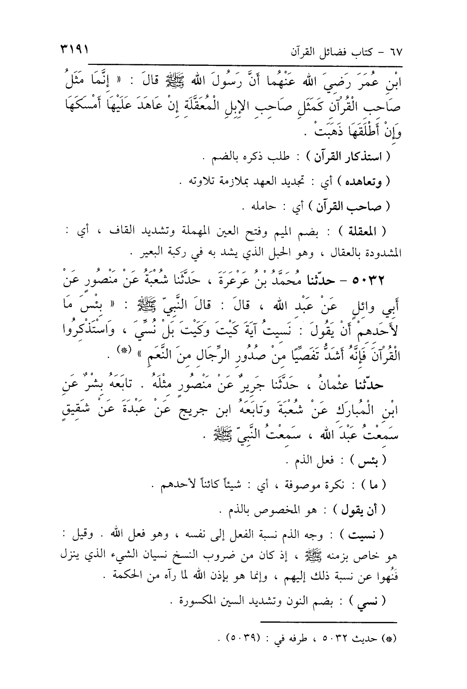 5032 - حَدَّثَنَا مُحَمَّدُ بْنُ عَرْعَرَةَ، حَدَّثَنَا شُعْبَةُ، عَنْ مَنْصُورٍ، عَنْ أَبِي وَائِلٍ، عَنْ عَبْدِ اللَّهِ، قَالَ: قَالَ النَّبِيُّ صَلَّى اللهُ عَلَيْهِ وَسَلَّمَ: «بِئْسَ مَا لِأَحَدِهِمْ أَنْ يَقُولَ نَسِيتُ آيَةَ كَيْتَ وَكَيْتَ، بَلْ نُسِّيَ وَاسْتَذْكِرُوا القُرْآنَ، فَإِنَّهُ أَشَدُّ تَفَصِّيًا مِنْ صُدُورِ الرِّجَالِ مِنَ النَّعَمِ».