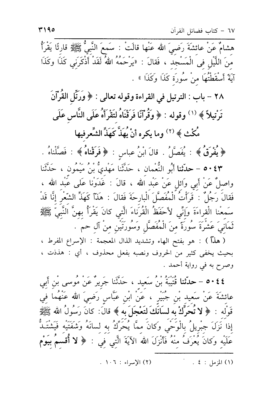 28 - بَابُ التَّرْتِيلِ فِي القِرَاءَةِ وَقَوْلِهِ تَعَالَى: {وَرَتِّلِ القُرْآنَ تَرْتِيلًا} [المزمل: 4] وَقَوْلِهِ: {وَقُرْآنًا فَرَقْنَاهُ لِتَقْرَأَهُ عَلَى النَّاسِ عَلَى مُكْثٍ} [الإسراء: 106]، «وَمَا يُكْرَهُ أَنْ يُهَذَّ كَهَذِّ الشِّعْرِ فِيهَا»
