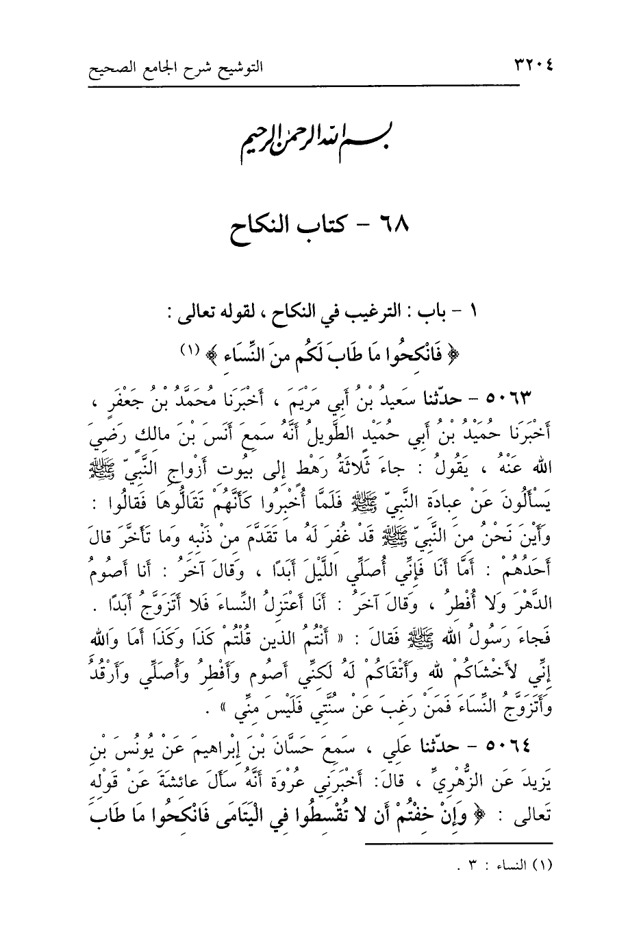 5063 - حَدَّثَنَا سَعِيدُ بْنُ أَبِي مَرْيَمَ، أَخْبَرَنَا مُحَمَّدُ بْنُ جَعْفَرٍ، أَخْبَرَنَا حُمَيْدُ بْنُ أَبِي حُمَيْدٍ الطَّوِيلُ، أَنَّهُ سَمِعَ أَنَسَ بْنَ مَالِكٍ رَضِيَ اللَّهُ عَنْهُ، يَقُولُ: جَاءَ ثَلاَثَةُ رَهْطٍ إِلَى بُيُوتِ أَزْوَاجِ النَّبِيِّ صَلَّى اللهُ عَلَيْهِ وَسَلَّمَ، يَسْأَلُونَ عَنْ عِبَادَةِ النَّبِيِّ صَلَّى اللهُ عَلَيْهِ وَسَلَّمَ، فَلَمَّا أُخْبِرُوا كَأَنَّهُمْ تَقَالُّوهَا، فَقَالُوا: وَأَيْنَ نَحْنُ مِنَ النَّبِيِّ صَلَّى اللهُ عَلَيْهِ وَسَلَّمَ؟ قَدْ غُفِرَ لَهُ مَا تَقَدَّمَ مِنْ ذَنْبِهِ وَمَا تَأَخَّرَ، قَالَ أَحَدُهُمْ: أَمَّا أَنَا فَإِنِّي أُصَلِّي اللَّيْلَ أَبَدًا، وَقَالَ آخَرُ: أَنَا أَصُومُ الدَّهْرَ وَلاَ أُفْطِرُ، وَقَالَ آخَرُ: أَنَا أَعْتَزِلُ النِّسَاءَ فَلاَ أَتَزَوَّجُ أَبَدًا، فَجَاءَ رَسُولُ اللَّهِ صَلَّى اللهُ عَلَيْهِ وَسَلَّمَ إِلَيْهِمْ، فَقَالَ: «أَنْتُمُ الَّذِينَ قُلْتُمْ كَذَا وَكَذَا، أَمَا وَاللَّهِ إِنِّي لَأَخْشَاكُمْ لِلَّهِ وَأَتْقَاكُمْ لَهُ، لَكِنِّي أَصُومُ وَأُفْطِرُ، وَأُصَلِّي وَأَرْقُدُ، وَأَتَزَوَّجُ النِّسَاءَ، فَمَنْ رَغِبَ عَنْ سُنَّتِي فَلَيْسَ مِنِّي».