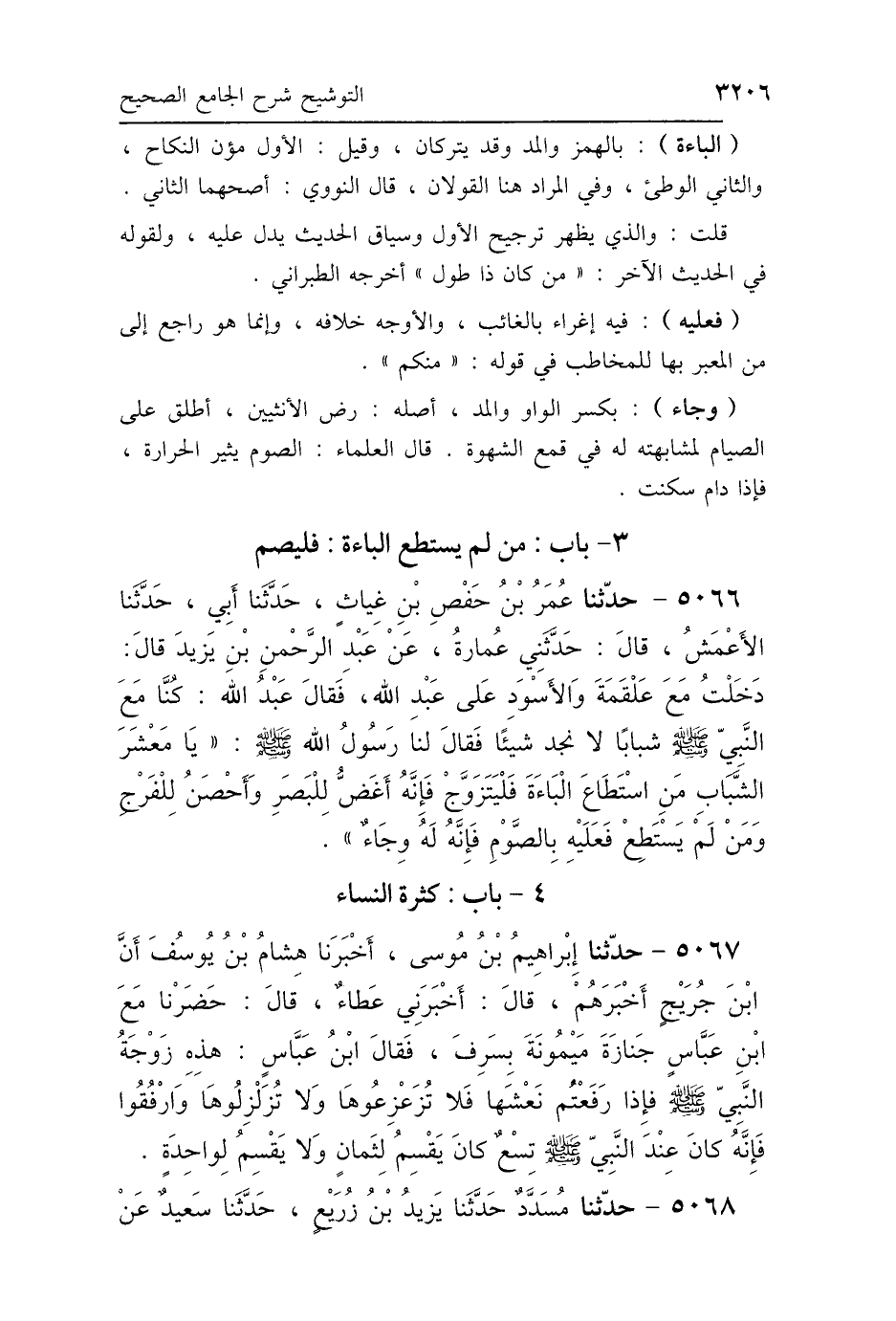 (الباءة): بالهمز والمد وقد يتركان، وقيل: الأول مؤن النكاح، والثاني الوطئ، وفي المراد هنا القولان، قال النووي: أصحهما الثاني.