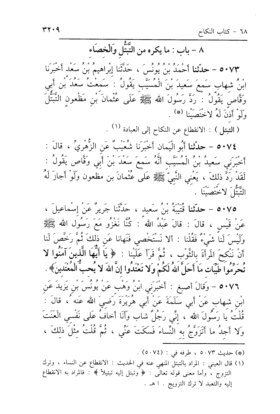 5073 - حَدَّثَنَا أَحْمَدُ بْنُ يُونُسَ، حَدَّثَنَا إِبْرَاهِيمُ بْنُ سَعْدٍ، أَخْبَرَنَا ابْنُ شِهَابٍ، سَمِعَ سَعِيدَ بْنَ المُسَيِّبِ، يَقُولُ: سَمِعْتُ سَعْدَ بْنَ أَبِي وَقَّاصٍ، يَقُولُ: «رَدَّ رَسُولُ اللَّهِ صَلَّى اللهُ عَلَيْهِ وَسَلَّمَ عَلَى عُثْمَانَ بْنِ مَظْعُونٍ التَّبَتُّلَ، وَلَوْ أَذِنَ لَهُ لاَخْتَصَيْنَا».