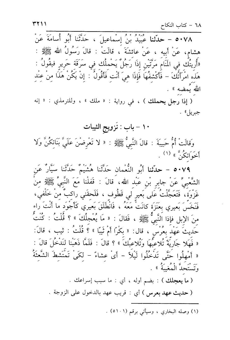 5079 - حَدَّثَنَا أَبُو النُّعْمَانِ، حَدَّثَنَا هُشَيْمٌ، حَدَّثَنَا سَيَّارٌ، عَنِ الشَّعْبِيِّ، عَنْ جَابِرِ بْنِ عَبْدِ اللَّهِ، قَالَ: قَفَلْنَا مَعَ النَّبِيِّ صَلَّى اللهُ عَلَيْهِ وَسَلَّمَ مِنْ غَزْوَةٍ، فَتَعَجَّلْتُ عَلَى بَعِيرٍ لِي قَطُوفٍ، فَلَحِقَنِي رَاكِبٌ مِنْ خَلْفِي، فَنَخَسَ بَعِيرِي بِعَنَزَةٍ كَانَتْ مَعَهُ، فَانْطَلَقَ بَعِيرِي كَأَجْوَدِ مَا أَنْتَ رَاءٍ مِنَ الإِبِلِ، فَإِذَا النَّبِيُّ صَلَّى اللهُ عَلَيْهِ وَسَلَّمَ، فَقَالَ: «مَا يُعْجِلُكَ» قُلْتُ: كُنْتُ حَدِيثَ عَهْدٍ بِعُرُسٍ، قَالَ: «أَبِكْرًا أَمْ ثَيِّبًا؟»، قُلْتُ: ثَيِّبًا، قَالَ: «فَهَلَّا جَارِيَةً تُلاَعِبُهَا وَتُلاَعِبُكَ»، قَالَ: فَلَمَّا ذَهَبْنَا لِنَدْخُلَ، قَالَ: «أَمْهِلُوا حَتَّى تَدْخُلُوا لَيْلًا - أَيْ عِشَاءً - لِكَيْ تَمْتَشِطَ الشَّعِثَةُ وَتَسْتَحِدَّ المُغِيبَةُ»