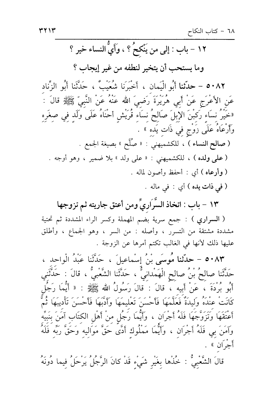 5082 - حَدَّثَنَا أَبُو اليَمَانِ، أَخْبَرَنَا شُعَيْبٌ، حَدَّثَنَا أَبُو الزِّنَادِ، عَنِ الأَعْرَجِ، عَنْ أَبِي هُرَيْرَةَ رَضِيَ اللَّهُ عَنْهُ، عَنِ النَّبِيِّ صَلَّى اللهُ عَلَيْهِ وَسَلَّمَ قَالَ: «خَيْرُ نِسَاءٍ رَكِبْنَ الإِبِلَ صَالِحُ نِسَاءِ قُرَيْشٍ، أَحْنَاهُ عَلَى وَلَدٍ فِي صِغَرِهِ، وَأَرْعَاهُ عَلَى زَوْجٍ فِي ذَاتِ يَدِهِ».