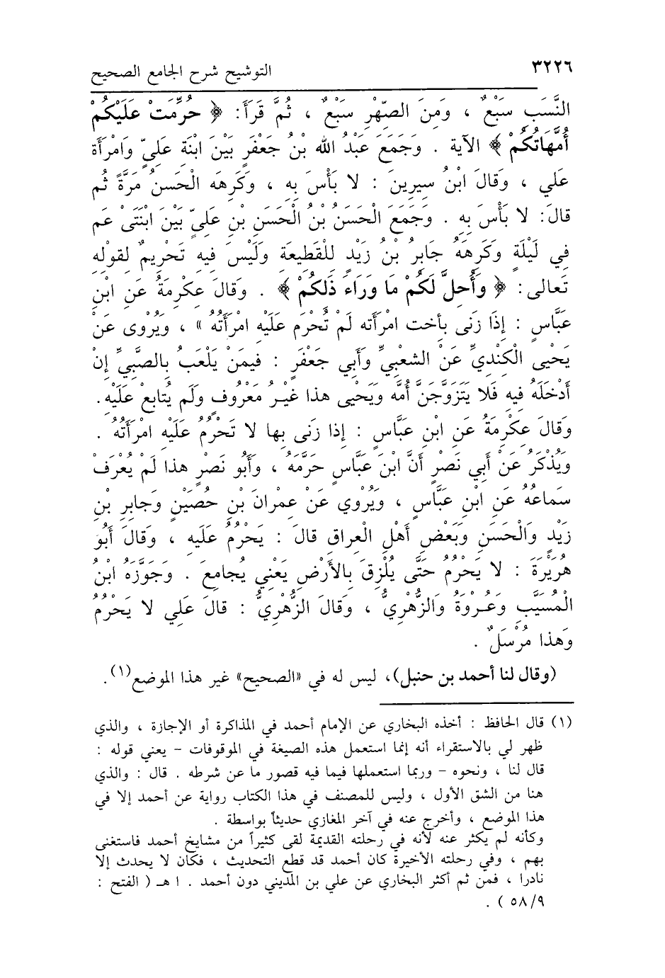 النَّسَبِ سَبْعٌ، وَمِنَ الصِّهْرِ سَبْعٌ» ثُمَّ قَرَأَ: {حُرِّمَتْ عَلَيْكُمْ أُمَّهَاتُكُمْ} [النساء: 23] الآيَةَ. وَجَمَعَ عَبْدُ اللَّهِ بْنُ جَعْفَرٍ، بَيْنَ ابْنَةِ عَلِيٍّ وَامْرَأَةِ عَلِيٍّ وَقَالَ ابْنُ سِيرِينَ: «لاَ بَأْسَ بِهِ» وَكَرِهَهُ الحَسَنُ مَرَّةً، ثُمَّ قَالَ: «لاَ بَأْسَ بِهِ»، وَجَمَعَ الحَسَنُ بْنُ الحَسَنِ بْنِ عَلِيٍّ، بَيْنَ ابْنَتَيْ عَمٍّ فِي لَيْلَةٍ، وَكَرِهَهُ جَابِرُ بْنُ زَيْدٍ، لِلْقَطِيعَةِ، وَلَيْسَ فِيهِ تَحْرِيمٌ، لِقَوْلِهِ تَعَالَى: {وَأُحِلَّ لَكُمْ مَا وَرَاءَ ذَلِكُمْ} [النساء: 24]، وَقَالَ عِكْرِمَةُ، عَنْ ابْنِ عَبَّاسٍ، «إِذَا زَنَى بِأُخْتِ امْرَأَتِهِ لَمْ تَحْرُمْ عَلَيْهِ امْرَأَتُهُ» وَيُرْوَى عَنْ يَحْيَى الكِنْدِيِّ، عَنِ الشَّعْبِيِّ، وأَبِي جَعْفَرٍ، فِيمَنْ يَلْعَبُ بِالصَّبِيِّ: «إِنْ أَدْخَلَهُ فِيهِ فَلاَ يَتَزَوَّجَنَّ أُمَّهُ» وَيَحْيَى هَذَا غَيْرُ مَعْرُوفٍ، وَلَمْ يُتَابَعْ عَلَيْهِ" وَقَالَ عِكْرِمَةُ، عَنْ ابْنِ عَبَّاسٍ: «إِذَا زَنَى بِهَا لَمْ تَحْرُمْ عَلَيْهِ امْرَأَتُهُ» وَيُذْكَرُ عَنْ أَبِي نَصْرٍ، أَنَّ ابْنَ عَبَّاسٍ، حَرَّمَهُ «وَأَبُونَصْرٍ هَذَا لَمْ يُعْرَفْ بِسَمَاعِهِ مِنْ ابْنِ عَبَّاسٍ» وَيُرْوَى عَنْ عِمْرَانَ بْنِ حُصَيْنٍ، وَجَابِرِ بْنِ زَيْدٍ، وَالحَسَنِ، وَبَعْضِ أَهْلِ العِرَاقِ تَحْرُمُ عَلَيْهِ. وَقَالَ أَبُو هُرَيْرَةَ: «لاَ تَحْرُمُ حَتَّى يُلْزِقَ بِالأَرْضِ» يَعْنِي يُجَامِعَ وَجَوَّزَهُ ابْنُ المُسَيِّبِ وَعُرْوَةُ، وَالزُّهْرِيُّ وَقَالَ الزُّهْرِيُّ: قَالَ عَلِيٌّ: «لاَ تَحْرُمُ» وَهَذَا مُرْسَلٌ.