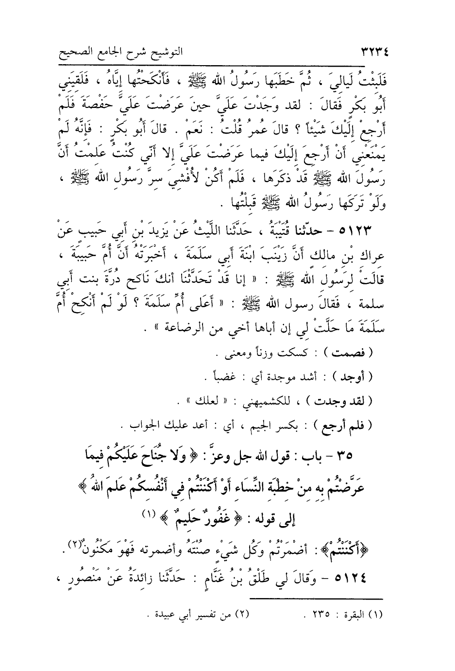 35 - بَابُ قَوْلِ اللَّهِ جَلَّ وَعَزَّ: {وَلاَ جُنَاحَ عَلَيْكُمْ فِيمَا عَرَّضْتُمْ بِهِ مِنْ خِطْبَةِ النِّسَاءِ، أَوْ أَكْنَنْتُمْ فِي أَنْفُسِكُمْ عَلِمَ اللَّهُ} [البقرة: 235]- الآيَةَ إِلَى قَوْلِهِ - {غَفُورٌ حَلِيمٌ} [البقرة: 225]
