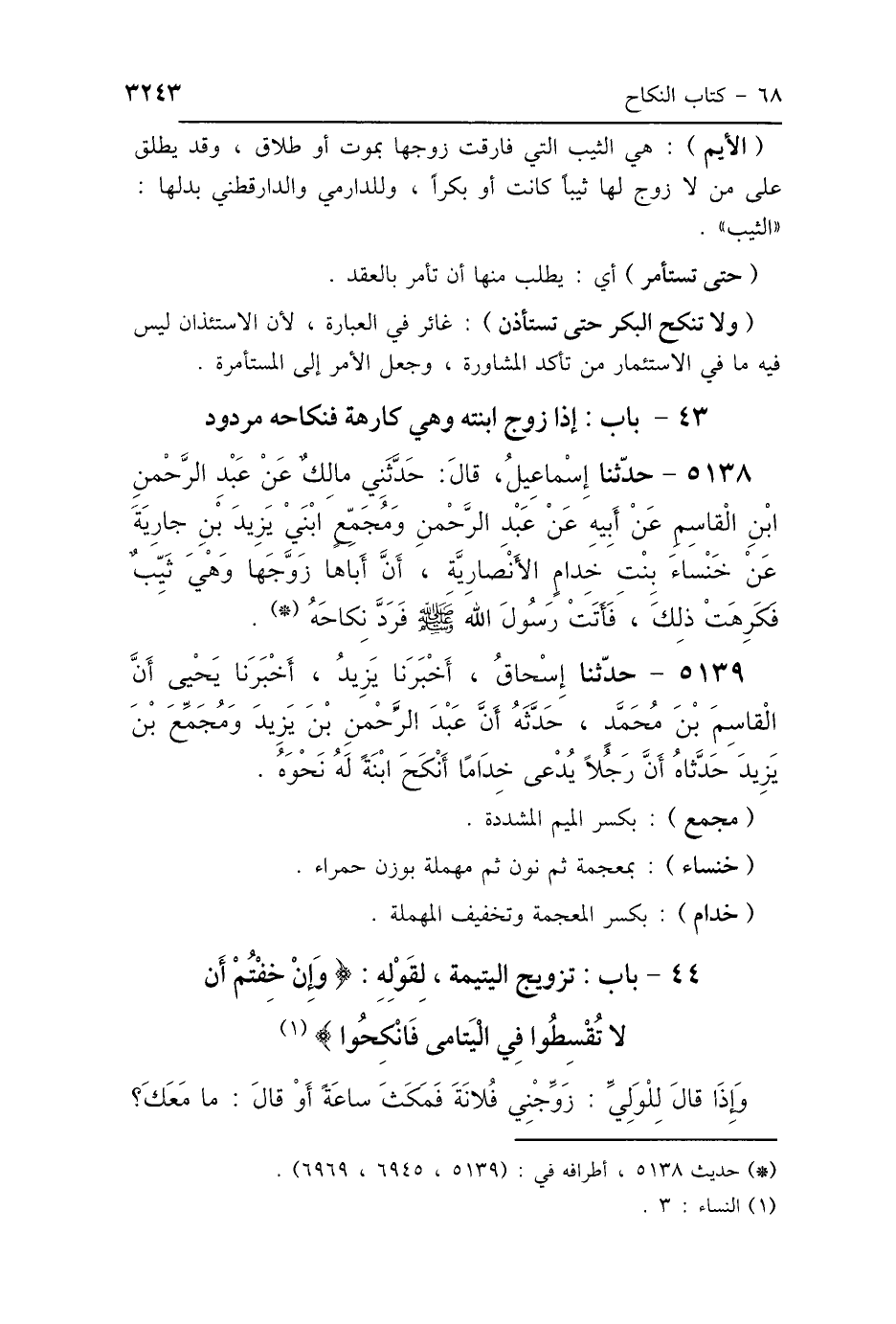 44 - بَابُ تَزْوِيجِ اليَتِيمَةِ لِقَوْلِهِ: {وَإِنْ خِفْتُمْ أَلَّا تُقْسِطُوا فِي اليَتَامَى فَانْكِحُوا} [النساء: 3]