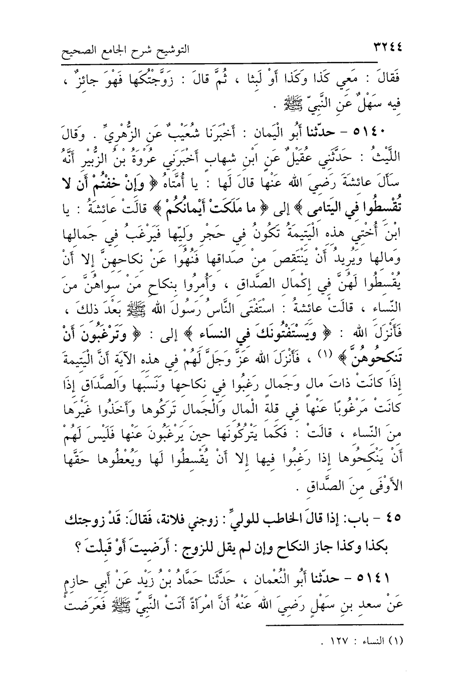 5140 - حَدَّثَنَا أَبُو اليَمَانِ، أَخْبَرَنَا شُعَيْبٌ، عَنِ الزُّهْرِيِّ، وَقَالَ اللَّيْثُ: حَدَّثَنِي عُقَيْلٌ، عَنِ ابْنِ شِهَابٍ، أَخْبَرَنِي عُرْوَةُ بْنُ الزُّبَيْرِ، أَنَّهُ سَأَلَ عَائِشَةَ رَضِيَ اللَّهُ عَنْهَا، قَالَ لَهَا: يَا أُمَّتَاهْ: {وَإِنْ خِفْتُمْ أَلَّا تُقْسِطُوا فِي اليَتَامَى} [النساء: 3]- إِلَى قَوْلِهِ - {مَا مَلَكَتْ أَيْمَانُكُمْ} [النساء: 3] قَالَتْ عَائِشَةُ: يَا ابْنَ أُخْتِي، هَذِهِ اليَتِيمَةُ تَكُونُ فِي حَجْرِ وَلِيِّهَا، فَيَرْغَبُ فِي جَمَالِهَا وَمَالِهَا، وَيُرِيدُ أَنْ يَنْتَقِصَ مِنْ صَدَاقِهَا «فَنُهُوا عَنْ نِكَاحِهِنَّ إِلَّا أَنْ يُقْسِطُوا لَهُنَّ فِي إِكْمَالِ الصَّدَاقِ، وَأُمِرُوا بِنِكَاحِ مَنْ سِوَاهُنَّ مِنَ النِّسَاءِ» قَالَتْ عَائِشَةُ: " اسْتَفْتَى النَّاسُ رَسُولَ اللَّهِ صَلَّى اللهُ عَلَيْهِ وَسَلَّمَ بَعْدَ ذَلِكَ، فَأَنْزَلَ اللَّهُ: {وَيَسْتَفْتُونَكَ فِي النِّسَاءِ} [النساء: 127]- إِلَى قَوْلِهِ - {وَتَرْغَبُونَ أَنْ تَنْكِحُوهُنَّ} [النساء: 127] فَأَنْزَلَ اللَّهُ عَزَّ وَجَلَّ لَهُمْ فِي هَذِهِ الآيَةِ: أَنَّ اليَتِيمَةَ إِذَا كَانَتْ ذَاتَ مَالٍ وَجَمَالٍ رَغِبُوا فِي نِكَاحِهَا وَنَسَبِهَا وَالصَّدَاقِ، وَإِذَا كَانَتْ مَرْغُوبًا عَنْهَا فِي قِلَّةِ المَالِ وَالجَمَالِ تَرَكُوهَا وَأَخَذُوا غَيْرَهَا مِنَ النِّسَاءِ " قَالَتْ: فَكَمَا يَتْرُكُونَهَا حِينَ يَرْغَبُونَ عَنْهَا، فَلَيْسَ لَهُمْ أَنْ يَنْكِحُوهَا إِذَا رَغِبُوا فِيهَا، إِلَّا أَنْ يُقْسِطُوا لَهَا وَيُعْطُوهَا حَقَّهَا الأَوْفَى مِنَ الصَّدَاقِ.