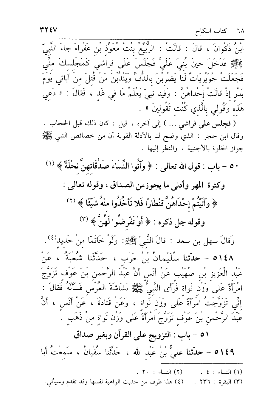 بْنُ ذَكْوَانَ، قَالَ: قَالَتِ الرُّبَيِّعُ بِنْتُ مُعَوِّذِ ابْنِ عَفْرَاءَ، جَاءَ النَّبِيُّ صَلَّى اللهُ عَلَيْهِ وَسَلَّمَ فَدَخَلَ حِينَ بُنِيَ عَلَيَّ، فَجَلَسَ عَلَى فِرَاشِي كَمَجْلِسِكَ مِنِّي، فَجَعَلَتْ جُوَيْرِيَاتٌ لَنَا، يَضْرِبْنَ بِالدُّفِّ وَيَنْدُبْنَ مَنْ قُتِلَ مِنْ آبَائِي يَوْمَ بَدْرٍ، إِذْ قَالَتْ إِحْدَاهُنَّ: وَفِينَا نَبِيٌّ يَعْلَمُ مَا فِي غَدٍ، فَقَالَ: «دَعِي هَذِهِ، وَقُولِي بِالَّذِي كُنْتِ تَقُولِينَ».