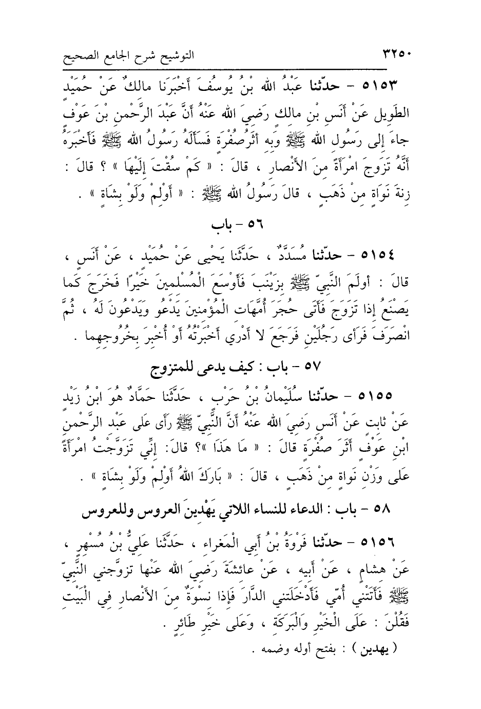 5153 - حَدَّثَنَا عَبْدُ اللَّهِ بْنُ يُوسُفَ، أَخْبَرَنَا مَالِكٌ، عَنْ حُمَيْدٍ الطَّوِيلِ، عَنْ أَنَسِ بْنِ مَالِكٍ رَضِيَ اللَّهُ عَنْهُ: أَنَّ عَبْدَ الرَّحْمَنِ بْنَ عَوْفٍ، جَاءَ إِلَى رَسُولِ اللَّهِ صَلَّى اللهُ عَلَيْهِ وَسَلَّمَ وَبِهِ أَثَرُ صُفْرَةٍ، فَسَأَلَهُ رَسُولُ اللَّهِ صَلَّى اللهُ عَلَيْهِ وَسَلَّمَ، فَأَخْبَرَهُ أَنَّهُ تَزَوَّجَ امْرَأَةً مِنَ الأَنْصَارِ، قَالَ: «كَمْ سُقْتَ إِلَيْهَا؟» قَالَ: زِنَةَ نَوَاةٍ مِنْ ذَهَبٍ، قَالَ رَسُولُ اللَّهِ صَلَّى اللهُ عَلَيْهِ وَسَلَّمَ: «أَوْلِمْ وَلَوْ بِشَاةٍ».