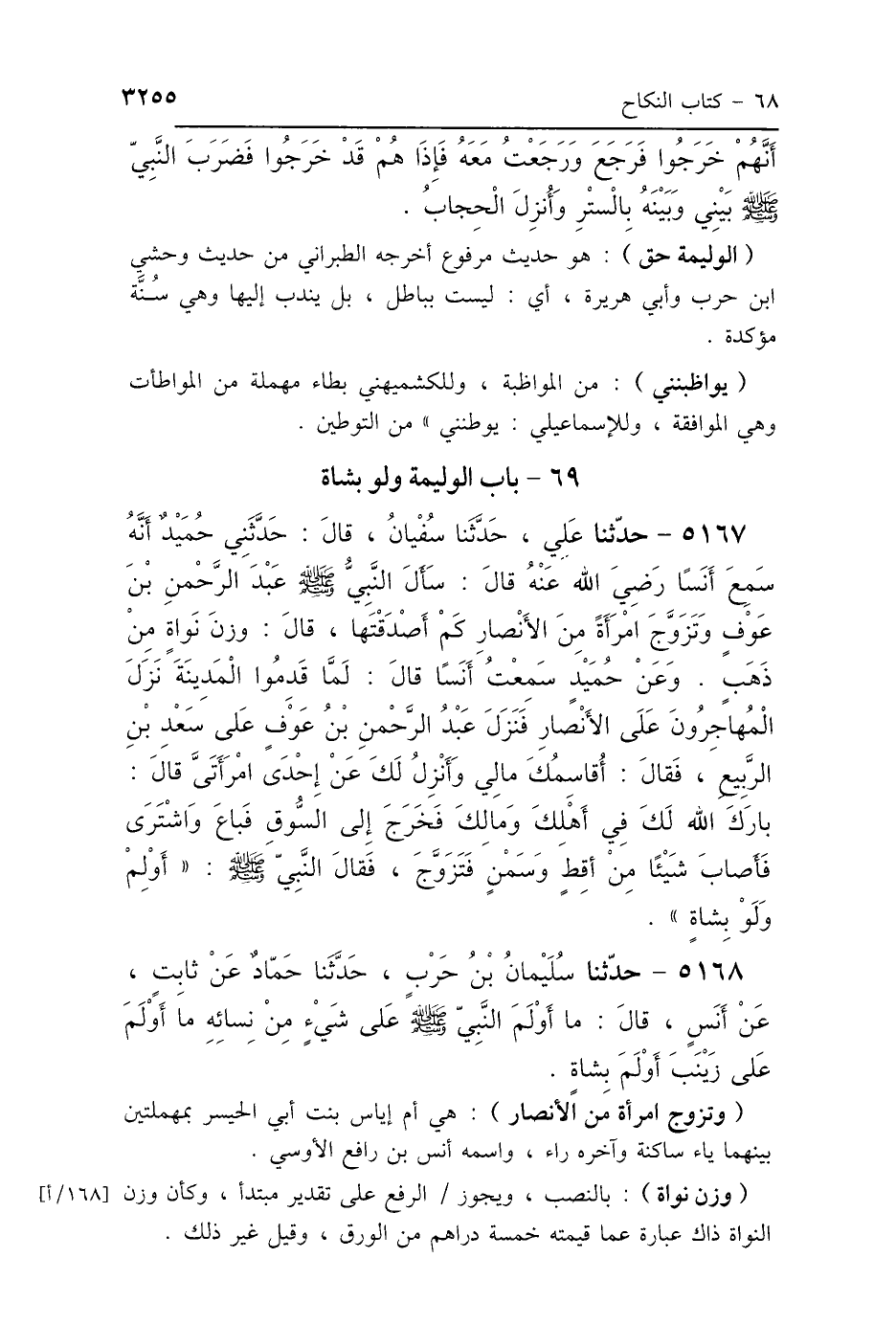 5168 - حَدَّثَنَا سُلَيْمَانُ بْنُ حَرْبٍ، حَدَّثَنَا حَمَّادٌ، عَنْ ثَابِتٍ، عَنْ أَنَسٍ، قَالَ: «مَا أَوْلَمَ النَّبِيُّ صَلَّى اللهُ عَلَيْهِ وَسَلَّمَ عَلَى شَيْءٍ مِنْ نِسَائِهِ مَا أَوْلَمَ عَلَى زَيْنَبَ، أَوْلَمَ بِشَاةٍ».