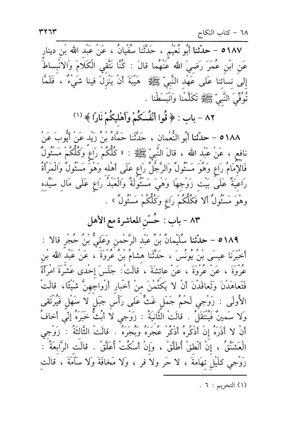 5188 - حَدَّثَنَا أَبُو النُّعْمَانِ، حَدَّثَنَا حَمَّادُ بْنُ زَيْدٍ، عَنْ أَيُّوبَ، عَنْ نَافِعٍ، عَنْ عَبْدِ اللَّهِ، قَالَ النَّبِيُّ صَلَّى اللهُ عَلَيْهِ وَسَلَّمَ: «كُلُّكُمْ رَاعٍ وَكُلُّكُمْ مَسْئُولٌ، فَالإِمَامُ رَاعٍ وَهُوَ مَسْئُولٌ، وَالرَّجُلُ رَاعٍ عَلَى أَهْلِهِ وَهُوَ مَسْئُولٌ، وَالمَرْأَةُ رَاعِيَةٌ عَلَى بَيْتِ زَوْجِهَا وَهِيَ مَسْئُولَةٌ، وَالعَبْدُ رَاعٍ عَلَى مَالِ سَيِّدِهِ وَهُوَ مَسْئُولٌ، أَلاَ فَكُلُّكُمْ رَاعٍ وَكُلُّكُمْ مَسْئُولٌ».