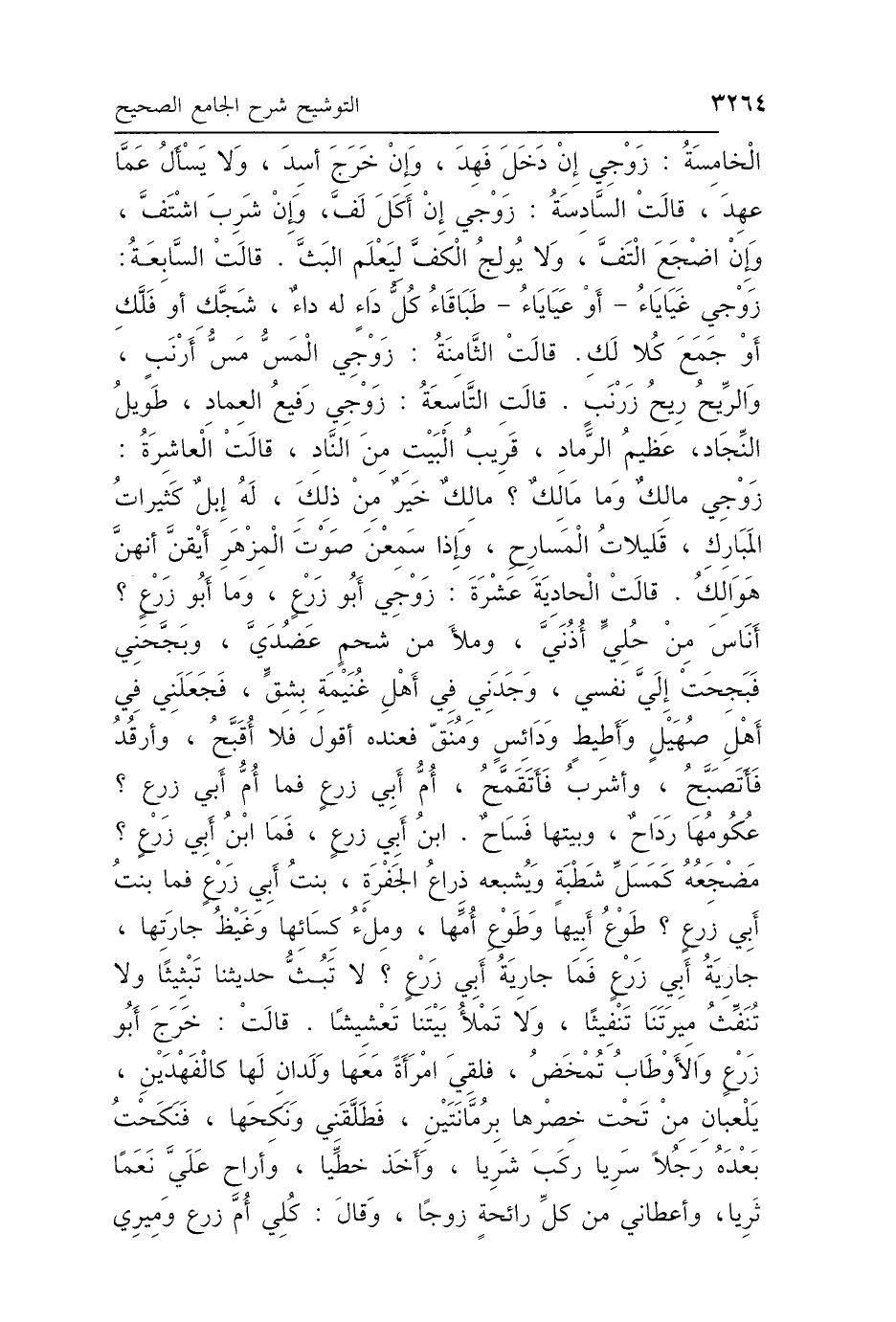 الخَامِسَةُ: زَوْجِي إِنْ دَخَلَ فَهِدَ، وَإِنْ خَرَجَ أَسِدَ، وَلاَ يَسْأَلُ عَمَّا عَهِدَ، قَالَتِ السَّادِسَةُ: زَوْجِي إِنْ أَكَلَ لَفَّ، وَإِنْ شَرِبَ اشْتَفَّ، وَإِنِ اضْطَجَعَ التَفَّ، وَلاَ يُولِجُ الكَفَّ لِيَعْلَمَ البَثَّ. قَالَتِ السَّابِعَةُ: زَوْجِي غَيَايَاءُ - أَوْ عَيَايَاءُ - طَبَاقَاءُ، كُلُّ دَاءٍ لَهُ دَاءٌ، شَجَّكِ أَوْ فَلَّكِ أَوْ جَمَعَ كُلًّا لَكِ، قَالَتِ الثَّامِنَةُ: زَوْجِي المَسُّ مَسُّ أَرْنَبٍ، وَالرِّيحُ رِيحُ زَرْنَبٍ، قَالَتِ التَّاسِعَةُ: زَوْجِي رَفِيعُ العِمَادِ، طَوِيلُ النِّجَادِ، عَظِيمُ الرَّمَادِ، قَرِيبُ البَيْتِ مِنَ النَّادِ، قَالَتِ العَاشِرَةُ: زَوْجِي مَالِكٌ وَمَا مَالِكٌ، مَالِكٌ خَيْرٌ مِنْ ذَلِكِ، لَهُ إِبِلٌ كَثِيرَاتُ المَبَارِكِ، قَلِيلاَتُ المَسَارِحِ، وَإِذَا سَمِعْنَ صَوْتَ المِزْهَرِ، أَيْقَنَّ أَنَّهُنَّ هَوَالِكُ، قَالَتِ الحَادِيَةَ عَشْرَةَ: زَوْجِي أَبُو زَرْعٍ، وَمَا أَبُو زَرْعٍ، أَنَاسَ مِنْ حُلِيٍّ أُذُنَيَّ، وَمَلَأَ مِنْ شَحْمٍ عَضُدَيَّ، وَبَجَّحَنِي فَبَجِحَتْ إِلَيَّ نَفْسِي، وَجَدَنِي فِي أَهْلِ غُنَيْمَةٍ بِشِقٍّ، فَجَعَلَنِي فِي أَهْلِ صَهِيلٍ وَأَطِيطٍ، وَدَائِسٍ وَمُنَقٍّ، فَعِنْدَهُ أَقُولُ فَلاَ أُقَبَّحُ، وَأَرْقُدُ فَأَتَصَبَّحُ، وَأَشْرَبُ فَأَتَقَنَّحُ، أُمُّ أَبِي زَرْعٍ، فَمَا أُمُّ أَبِي زَرْعٍ، عُكُومُهَا رَدَاحٌ، وَبَيْتُهَا فَسَاحٌ، ابْنُ أَبِي زَرْعٍ، فَمَا ابْنُ أَبِي زَرْعٍ، مَضْجَعُهُ كَمَسَلِّ شَطْبَةٍ، وَيُشْبِعُهُ ذِرَاعُ الجَفْرَةِ، بِنْتُ أَبِي زَرْعٍ، فَمَا بِنْتُ أَبِي زَرْعٍ، طَوْعُ أَبِيهَا، وَطَوْعُ أُمِّهَا، وَمِلْءُ كِسَائِهَا، وَغَيْظُ جَارَتِهَا، جَارِيَةُ أَبِي زَرْعٍ، فَمَا جَارِيَةُ أَبِي زَرْعٍ، لاَ تَبُثُّ حَدِيثَنَا تَبْثِيثًا، وَلاَ تُنَقِّثُ مِيرَتَنَا تَنْقِيثًا، وَلاَ تَمْلَأُ بَيْتَنَا تَعْشِيشًا، قَالَتْ: خَرَجَ أَبُو زَرْعٍ وَالأَوْطَابُ تُمْخَضُ، فَلَقِيَ امْرَأَةً مَعَهَا وَلَدَانِ لَهَا كَالفَهْدَيْنِ، يَلْعَبَانِ مِنْ تَحْتِ خَصْرِهَا بِرُمَّانَتَيْنِ، فَطَلَّقَنِي وَنَكَحَهَا، فَنَكَحْتُ بَعْدَهُ رَجُلًا سَرِيًّا، رَكِبَ شَرِيًّا، وَأَخَذَ خَطِّيًّا، وَأَرَاحَ عَلَيَّ نَعَمًا ثَرِيًّا، وَأَعْطَانِي مِنْ كُلِّ رَائِحَةٍ زَوْجًا، وَقَالَ: كُلِي أُمَّ زَرْعٍ وَمِيرِي