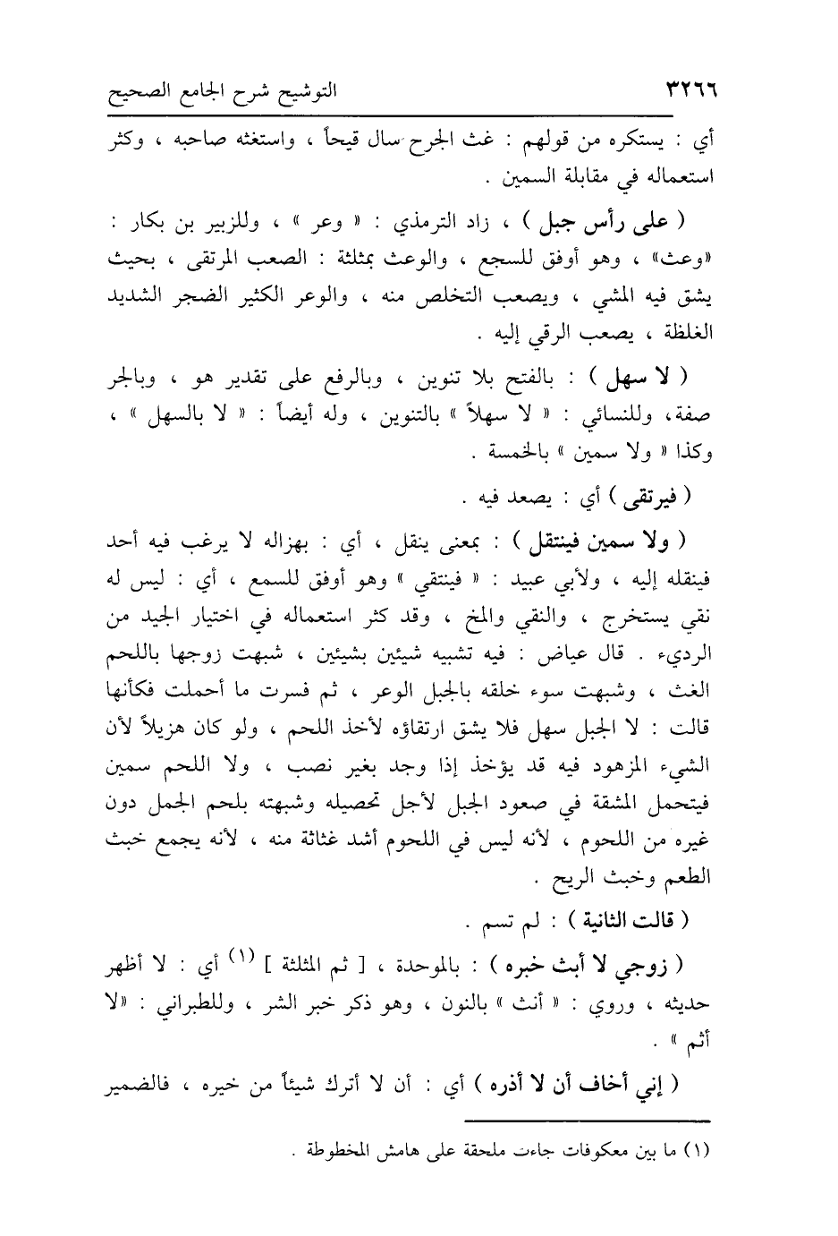 (على رأس جبل)، زاد الترمذي: "وعر"، وللزبير بن بكار: "وعث"، وهو أوفق للسجع، والوعث بمثلثة: الصعب المرتقى، بحيث يشق فيه المشي، ويصعب التخلص منه، والوعر الكثير الضجر الشديد الغلظة، يصعب الرقي إليه.