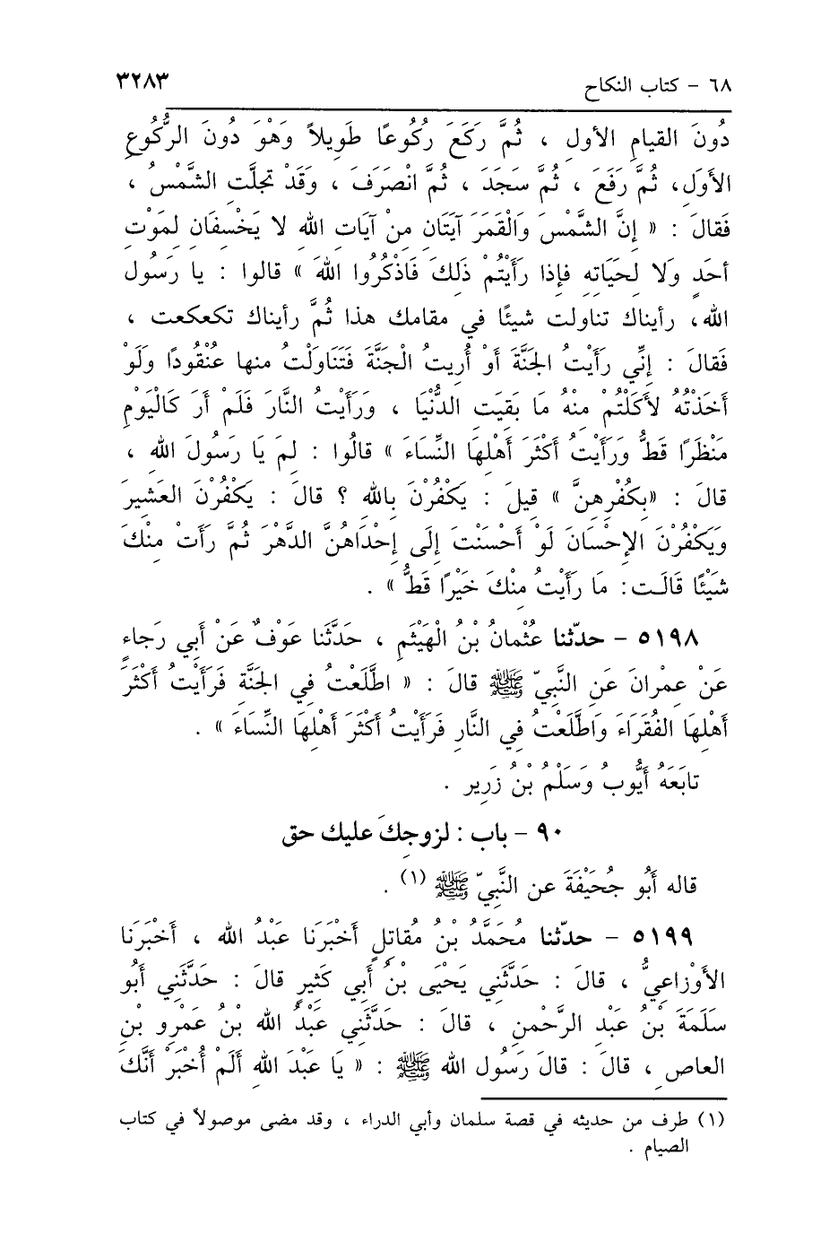 دُونَ القِيَامِ الأَوَّلِ، ثُمَّ رَكَعَ رُكُوعًا طَوِيلًا، وَهُوَ دُونَ الرُّكُوعِ الأَوَّلِ، ثُمَّ رَفَعَ، ثُمَّ سَجَدَ، ثُمَّ انْصَرَفَ، وَقَدْ تَجَلَّتِ الشَّمْسُ، فَقَالَ: «إِنَّ الشَّمْسَ وَالقَمَرَ آيَتَانِ مِنْ آيَاتِ اللَّهِ، لاَ يَخْسِفَانِ لِمَوْتِ أَحَدٍ وَلاَ لِحَيَاتِهِ، فَإِذَا رَأَيْتُمْ ذَلِكَ فَاذْكُرُوا اللَّهَ» قَالُوا: يَا رَسُولَ اللَّهِ، رَأَيْنَاكَ تَنَاوَلْتَ شَيْئًا فِي مَقَامِكَ هَذَا، ثُمَّ رَأَيْنَاكَ تَكَعْكَعْتَ؟ فَقَالَ: «إِنِّي رَأَيْتُ الجَنَّةَ، أَوْ أُرِيتُ الجَنَّةَ، فَتَنَاوَلْتُ مِنْهَا عُنْقُودًا، وَلَوْ أَخَذْتُهُ لَأَكَلْتُمْ مِنْهُ مَا بَقِيَتِ الدُّنْيَا، وَرَأَيْتُ النَّارَ، فَلَمْ أَرَ كَاليَوْمِ مَنْظَرًا قَطُّ، وَرَأَيْتُ أَكْثَرَ أَهْلِهَا النِّسَاءَ» قَالُوا: لِمَ يَا رَسُولَ اللَّهِ؟ قَالَ: «بِكُفْرِهِنَّ» قِيلَ: يَكْفُرْنَ بِاللَّهِ؟ قَالَ: " يَكْفُرْنَ العَشِيرَ، وَيَكْفُرْنَ الإِحْسَانَ، لَوْ أَحْسَنْتَ إِلَى إِحْدَاهُنَّ الدَّهْرَ، ثُمَّ رَأَتْ مِنْكَ شَيْئًا، قَالَتْ: مَا رَأَيْتُ مِنْكَ خَيْرًا قَطُّ".