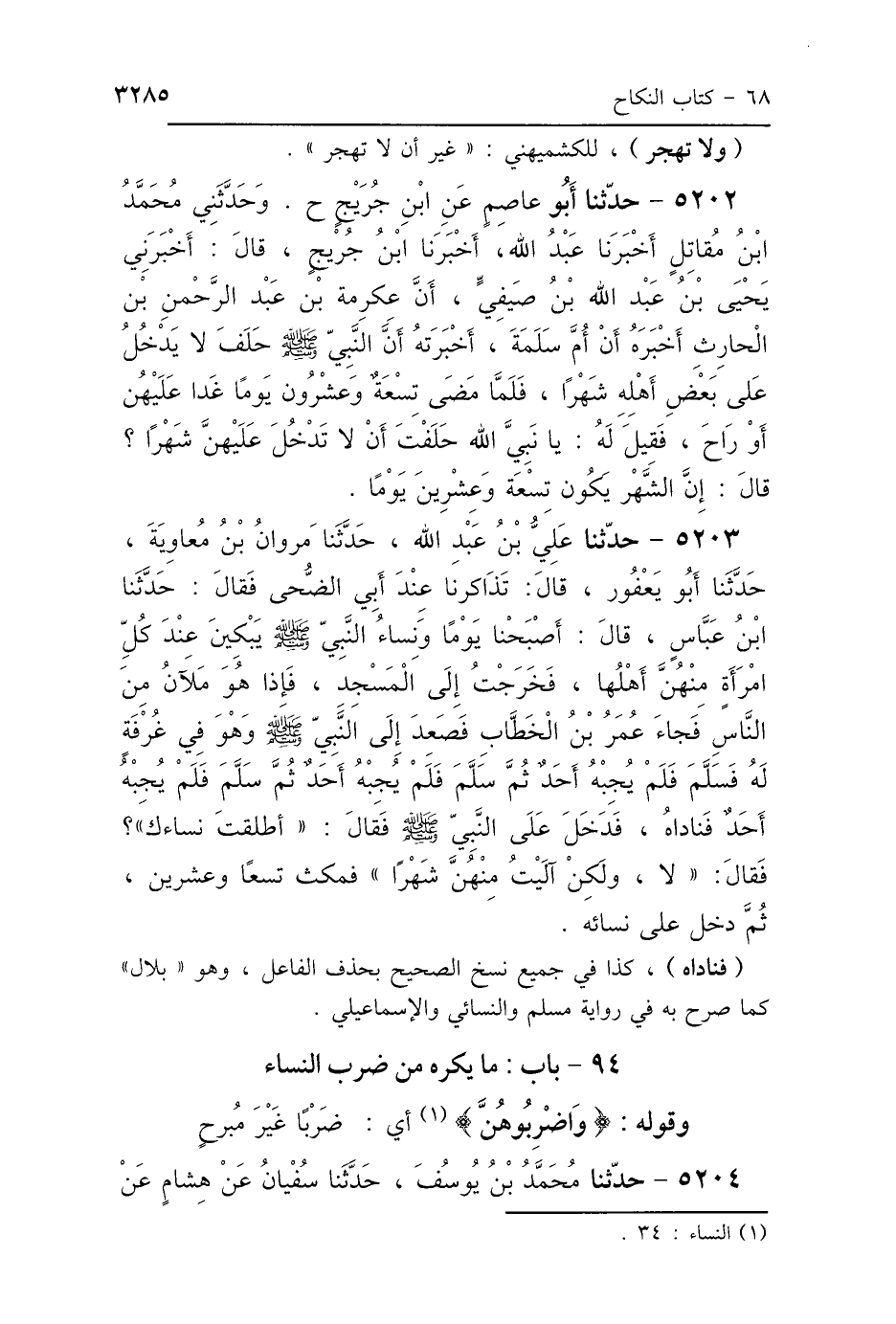 5203 - حَدَّثَنَا عَلِيُّ بْنُ عَبْدِ اللَّهِ، حَدَّثَنَا مَرْوَانُ بْنُ مُعَاوِيَةَ، حَدَّثَنَا أَبُو يَعْفُورٍ، قَالَ: تَذَاكَرْنَا عِنْدَ أَبِي الضُّحَى، فَقَالَ: حَدَّثَنَا ابْنُ عَبَّاسٍ، قَالَ: أَصْبَحْنَا يَوْمًا وَنِسَاءُ النَّبِيِّ صَلَّى اللهُ عَلَيْهِ وَسَلَّمَ يَبْكِينَ، عِنْدَ كُلِّ امْرَأَةٍ مِنْهُنَّ أَهْلُهَا، فَخَرَجْتُ إِلَى المَسْجِدِ، فَإِذَا هُوَ مَلْآنُ مِنَ النَّاسِ، فَجَاءَ عُمَرُ بْنُ الخَطَّابِ، فَصَعِدَ إِلَى النَّبِيِّ صَلَّى اللهُ عَلَيْهِ وَسَلَّمَ وَهُوَ فِي غُرْفَةٍ لَهُ، فَسَلَّمَ فَلَمْ يُجِبْهُ أَحَدٌ، ثُمَّ سَلَّمَ فَلَمْ يُجِبْهُ أَحَدٌ، ثُمَّ سَلَّمَ فَلَمْ يُجِبْهُ أَحَدٌ، فَنَادَاهُ، فَدَخَلَ عَلَى النَّبِيِّ صَلَّى اللهُ عَلَيْهِ وَسَلَّمَ فَقَالَ: أَطَلَّقْتَ نِسَاءَكَ؟ فَقَالَ: «لاَ، وَلَكِنْ آلَيْتُ مِنْهُنَّ شَهْرًا» فَمَكَثَ تِسْعًا وَعِشْرِينَ ثُمَّ دَخَلَ عَلَى نِسَائِهِ.