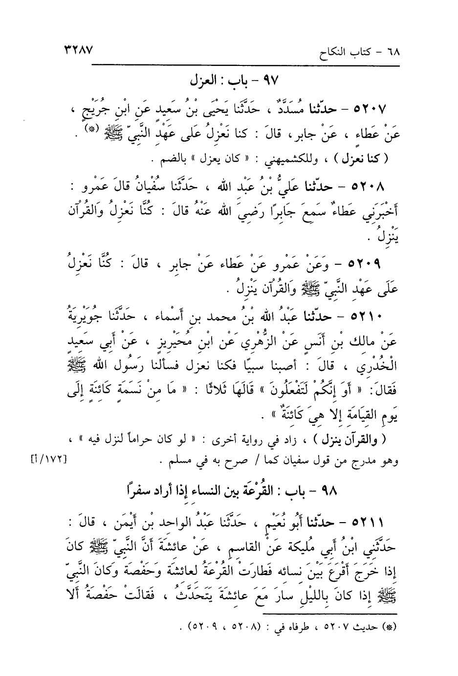 5207 - حَدَّثَنَا مُسَدَّدٌ، حَدَّثَنَا يَحْيَى بْنُ سَعِيدٍ، عَنِ ابْنِ جُرَيْجٍ، عَنْ عَطَاءٍ، عَنْ جَابِرٍ، قَالَ: «كُنَّا نَعْزِلُ عَلَى عَهْدِ النَّبِيِّ صَلَّى اللهُ عَلَيْهِ وَسَلَّمَ».