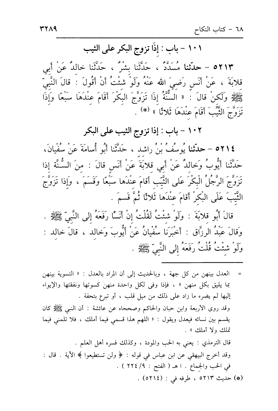 5214 - حَدَّثَنَا يُوسُفُ بْنُ رَاشِدٍ، حَدَّثَنَا أَبُو أُسَامَةَ، عَنْ سُفْيَانَ، حَدَّثَنَا أَيُّوبُ، وَخَالِدٌ، عَنْ أَبِي قِلاَبَةَ، عَنْ أَنَسٍ، قَالَ: «مِنَ السُّنَّةِ إِذَا تَزَوَّجَ الرَّجُلُ البِكْرَ عَلَى الثَّيِّبِ أَقَامَ عِنْدَهَا سَبْعًا وَقَسَمَ، وَإِذَا تَزَوَّجَ الثَّيِّبَ عَلَى البِكْرِ أَقَامَ عِنْدَهَا ثَلاَثًا ثُمَّ قَسَمَ» قَالَ أَبُو قِلاَبَةَ: وَلَوْ شِئْتُ لَقُلْتُ: إِنَّ أَنَسًا رَفَعَهُ إِلَى النَّبِيِّ صَلَّى اللهُ عَلَيْهِ وَسَلَّمَ وَقَالَ عَبْدُ الرَّزَّاقِ، أَخْبَرَنَا سُفْيَانُ، عَنْ أَيُّوبَ، وَخَالِدٍ، قَالَ خَالِدٌ: وَلَوْ شِئْتُ قُلْتُ رَفَعَهُ إِلَى النَّبِيِّ صَلَّى اللهُ عَلَيْهِ وَسَلَّمَ.