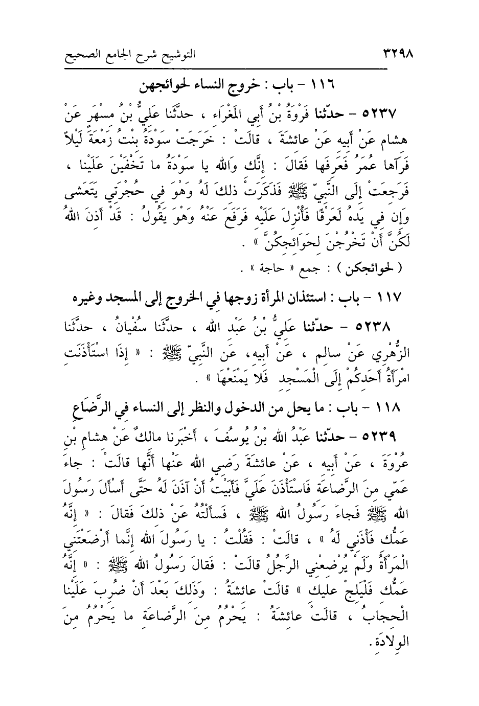 5237 - حَدَّثَنَا فَرْوَةُ بْنُ أَبِي المَغْرَاءِ، حَدَّثَنَا عَلِيُّ بْنُ مُسْهِرٍ، عَنْ هِشَامٍ، عَنْ أَبِيهِ، عَنْ عَائِشَةَ، قَالَتْ: خَرَجَتْ سَوْدَةُ بِنْتُ زَمْعَةَ لَيْلًا، فَرَآهَا عُمَرُ فَعَرَفَهَا، فَقَالَ: إِنَّكِ وَاللَّهِ يَا سَوْدَةُ مَا تَخْفَيْنَ عَلَيْنَا، فَرَجَعَتْ إِلَى النَّبِيِّ صَلَّى اللهُ عَلَيْهِ وَسَلَّمَ فَذَكَرَتْ ذَلِكَ لَهُ، وَهُوَ فِي حُجْرَتِي يَتَعَشَّى، وَإِنَّ فِي يَدِهِ لَعَرْقًا، فَأَنْزَلَ اللَّهُ عَلَيْهِ، فَرُفِعَ عَنْهُ وَهُوَ يَقُولُ: «قَدْ أَذِنَ اللَّهُ لَكُنَّ أَنْ تَخْرُجْنَ لِحَوَائِجِكُنَّ».