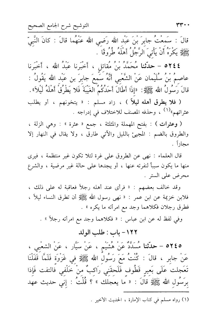 5244 - حَدَّثَنَا مُحَمَّدُ بْنُ مُقَاتِلٍ، أَخْبَرَنَا عَبْدُ اللَّهِ، أَخْبَرَنَا عَاصِمُ بْنُ سُلَيْمَانَ، عَنِ الشَّعْبِيِّ، أَنَّهُ سَمِعَ جَابِرَ بْنَ عَبْدِ اللَّهِ، يَقُولُ: قَالَ رَسُولُ اللَّهِ صَلَّى اللهُ عَلَيْهِ وَسَلَّمَ: «إِذَا أَطَالَ أَحَدُكُمُ الغَيْبَةَ فَلاَ يَطْرُقْ أَهْلَهُ لَيْلًا».