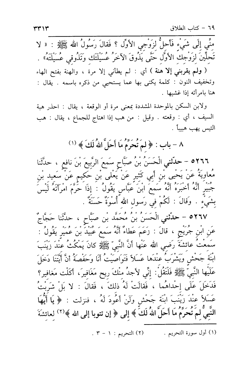 5266 - حَدَّثَنِي الحَسَنُ بْنُ صَبَّاحٍ، سَمِعَ الرَّبِيعَ بْنَ نَافِعٍ، حَدَّثَنَا مُعَاوِيَةُ، عَنْ يَحْيَى بْنِ أَبِي كَثِيرٍ، عَنْ يَعْلَى بْنِ حَكِيمٍ، عَنْ سَعِيدِ بْنِ جُبَيْرٍ، أَنَّهُ أَخْبَرَهُ: أَنَّهُ سَمِعَ ابْنَ عَبَّاسٍ، يَقُولُ: «إِذَا حَرَّمَ امْرَأَتَهُ لَيْسَ بِشَيْءٍ» وَقَالَ: {لَقَدْ كَانَ لَكُمْ فِي رَسُولِ اللَّهِ أُسْوَةٌ حَسَنَةٌ} [الأحزاب: 21].