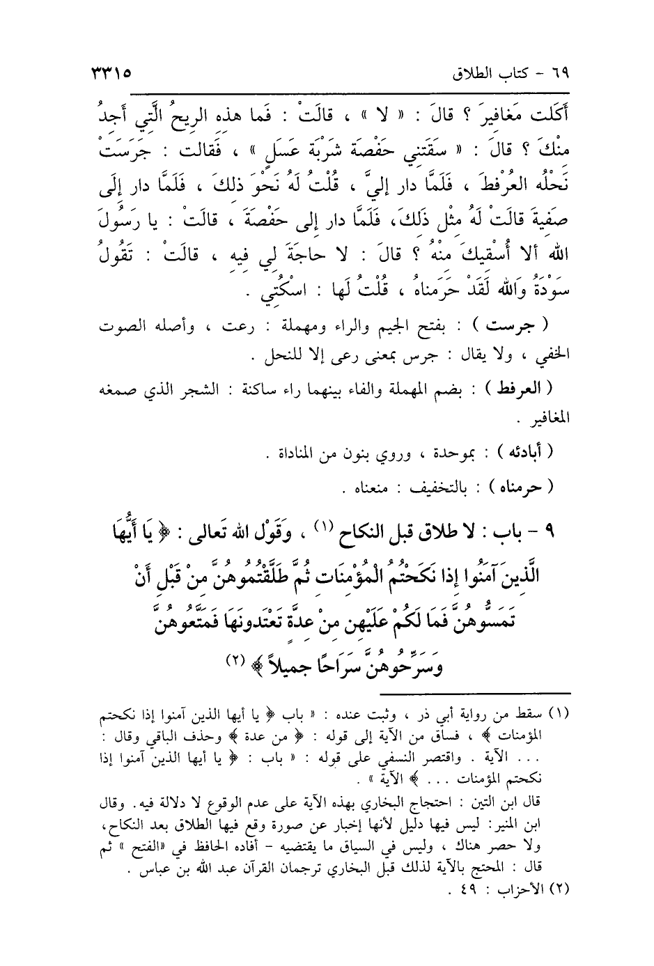 أَكَلْتَ مَغَافِيرَ؟ قَالَ: «لاَ» قَالَتْ: فَمَا هَذِهِ الرِّيحُ الَّتِي أَجِدُ مِنْكَ؟ قَالَ: «سَقَتْنِي حَفْصَةُ شَرْبَةَ عَسَلٍ» فَقَالَتْ: جَرَسَتْ نَحْلُهُ العُرْفُطَ، فَلَمَّا دَارَ إِلَيَّ قُلْتُ لَهُ نَحْوَ ذَلِكَ، فَلَمَّا دَارَ إِلَى صَفِيَّةَ قَالَتْ لَهُ مِثْلَ ذَلِكَ، فَلَمَّا دَارَ إِلَى حَفْصَةَ قَالَتْ: يَا رَسُولَ اللَّهِ، أَلاَ أَسْقِيكَ مِنْهُ؟ قَالَ: «لاَ حَاجَةَ لِي فِيهِ» قَالَتْ: تَقُولُ سَوْدَةُ: وَاللَّهِ لَقَدْ حَرَمْنَاهُ، قُلْتُ لَهَا: اسْكُتِي.