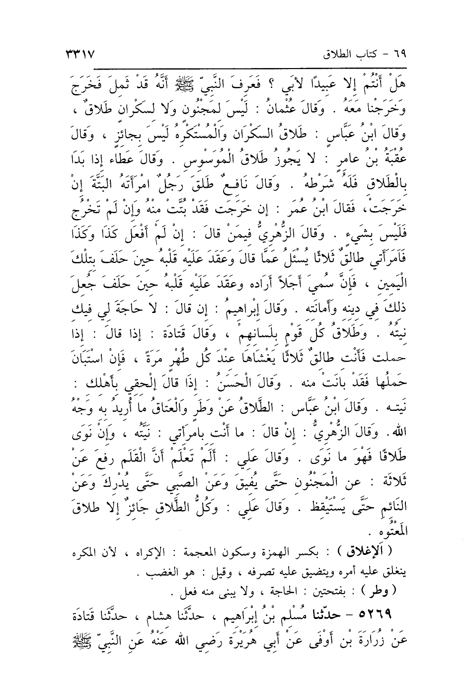 هَلْ أَنْتُمْ إِلَّا عَبِيدٌ لِأَبِي، فَعَرَفَ النَّبِيُّ صَلَّى اللهُ عَلَيْهِ وَسَلَّمَ أَنَّهُ قَدْ ثَمِلَ، فَخَرَجَ وَخَرَجْنَا مَعَهُ وَقَالَ عُثْمَانُ: «لَيْسَ لِمَجْنُونٍ وَلاَ لِسَكْرَانَ طَلاَقٌ» وَقَالَ ابْنُ عَبَّاسٍ: «طَلاَقُ السَّكْرَانِ وَالمُسْتَكْرَهِ لَيْسَ بِجَائِزٍ» وَقَالَ عُقْبَةُ بْنُ عَامِرٍ: «لاَ يَجُوزُ طَلاَقُ المُوَسْوِسِ» وَقَالَ عَطَاءٌ: «إِذَا بَدَا بِالطَّلاَقِ فَلَهُ شَرْطُهُ» وَقَالَ نَافِعٌ: طَلَّقَ رَجُلٌ امْرَأَتَهُ البَتَّةَ إِنْ خَرَجَتْ فَقَالَ ابْنُ عُمَرَ: «إِنْ خَرَجَتْ فَقَدْ بُتَّتْ مِنْهُ، وَإِنْ لَمْ تَخْرُجْ فَلَيْسَ بِشَيْءٍ» وَقَالَ الزُّهْرِيُّ: " فِيمَنْ قَالَ: إِنْ لَمْ أَفْعَلْ كَذَا وَكَذَا فَامْرَأَتِي طَالِقٌ ثَلاَثًا: يُسْأَلُ عَمَّا قَالَ وَعَقَدَ عَلَيْهِ قَلْبُهُ حِينَ حَلَفَ بِتِلْكَ اليَمِينِ؟ فَإِنْ سَمَّى أَجَلًا أَرَادَهُ وَعَقَدَ عَلَيْهِ قَلْبُهُ حِينَ حَلَفَ، جُعِلَ ذَلِكَ فِي دِينِهِ وَأَمَانَتِهِ " وَقَالَ إِبْرَاهِيمُ: " إِنْ قَالَ: لاَ حَاجَةَ لِي فِيكِ، نِيَّتُهُ، وَطَلاَقُ كُلِّ قَوْمٍ بِلِسَانهِمْ " وَقَالَ قَتَادَةُ: " إِذَا قَالَ: إِذَا حَمَلْتِ فَأَنْتِ طَالِقٌ ثَلاَثًا، يَغْشَاهَا عِنْدَ كُلِّ طُهْرٍ مَرَّةً، فَإِنِ اسْتَبَانَ حَمْلُهَا فَقَدْ بَانَتْ مِنْهُ " وَقَالَ الحَسَنُ: " إِذَا قَالَ: الحَقِي بِأَهْلِكِ، نِيَّتُهُ وَقَالَ ابْنُ عَبَّاسٍ: «الطَّلاَقُ عَنْ وَطَرٍ، وَالعَتَاقُ مَا أُرِيدَ بِهِ وَجْهُ اللَّهِ» وَقَالَ الزُّهْرِيُّ: " إِنْ قَالَ: مَا أَنْتِ بِامْرَأَتِي، نِيَّتُهُ، وَإِنْ نَوَى طَلاَقًا فَهُوَ مَا نَوَى " وَقَالَ عَلِيٌّ: " أَلَمْ تَعْلَمْ أَنَّ القَلَمَ رُفِعَ عَنْ ثَلاَثَةٍ: عَنِ المَجْنُونِ حَتَّى يُفِيقَ، وَعَنِ الصَّبِيِّ حَتَّى يُدْرِكَ، وَعَنِ النَّائِمِ حَتَّى يَسْتَيْقِظَ " وَقَالَ عَلِيٌّ: «وَكُلُّ الطَّلاَقِ جَائِزٌ، إِلَّا طَلاَقَ المَعْتُوهِ».