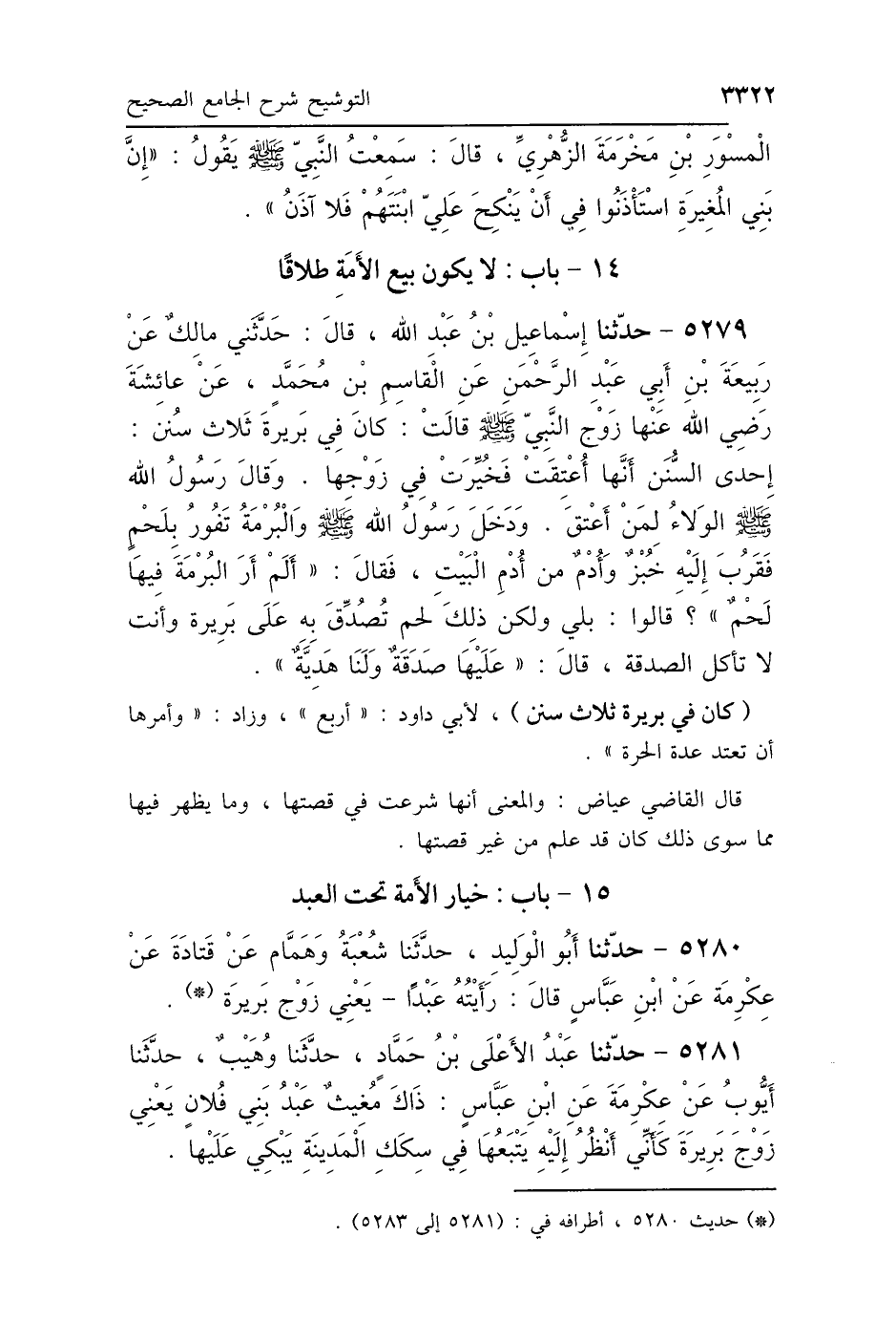 5280 - حَدَّثَنَا أَبُو الوَلِيدِ، حَدَّثَنَا شُعْبَةُ، وَهَمَّامٌ، عَنْ قَتَادَةَ، عَنْ عِكْرِمَةَ، عَنِ ابْنِ عَبَّاسٍ، قَالَ: «رَأَيْتُهُ عَبْدًا» يَعْنِي زَوْجَ بَرِيرَةَ.