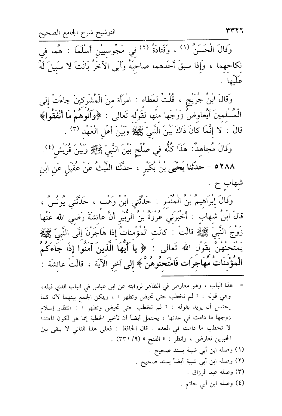 وَقَالَ الحَسَنُ، وَقَتَادَةُ: فِي مَجُوسِيَّيْنِ أَسْلَمَا: هُمَا عَلَى نِكَاحِهِمَا، وَإِذَا سَبَقَ أَحَدُهُمَا صَاحِبَهُ وَأَبَى الآخَرُ بَانَتْ، لاَ سَبِيلَ لَهُ عَلَيْهَا وَقَالَ ابْنُ جُرَيْجٍ: قُلْتُ لِعَطَاءٍ: امْرَأَةٌ مِنَ المُشْرِكِينَ جَاءَتْ إِلَى المُسْلِمِينَ، أَيُعَاوَضُ زَوْجُهَا مِنْهَا، لِقَوْلِهِ تَعَالَى: {وَآتُوهُمْ مَا أَنْفَقُوا} [الممتحنة: 10] قَالَ: " لاَ، إِنَّمَا كَانَ ذَاكَ بَيْنَ النَّبِيِّ صَلَّى اللهُ عَلَيْهِ وَسَلَّمَ وَبَيْنَ أَهْلِ العَهْدِ وَقَالَ مُجَاهِدٌ: هَذَا كُلُّهُ فِي صُلْحٍ بَيْنَ النَّبِيِّ صَلَّى اللهُ عَلَيْهِ وَسَلَّمَ وَبَيْنَ قُرَيْشٍ.