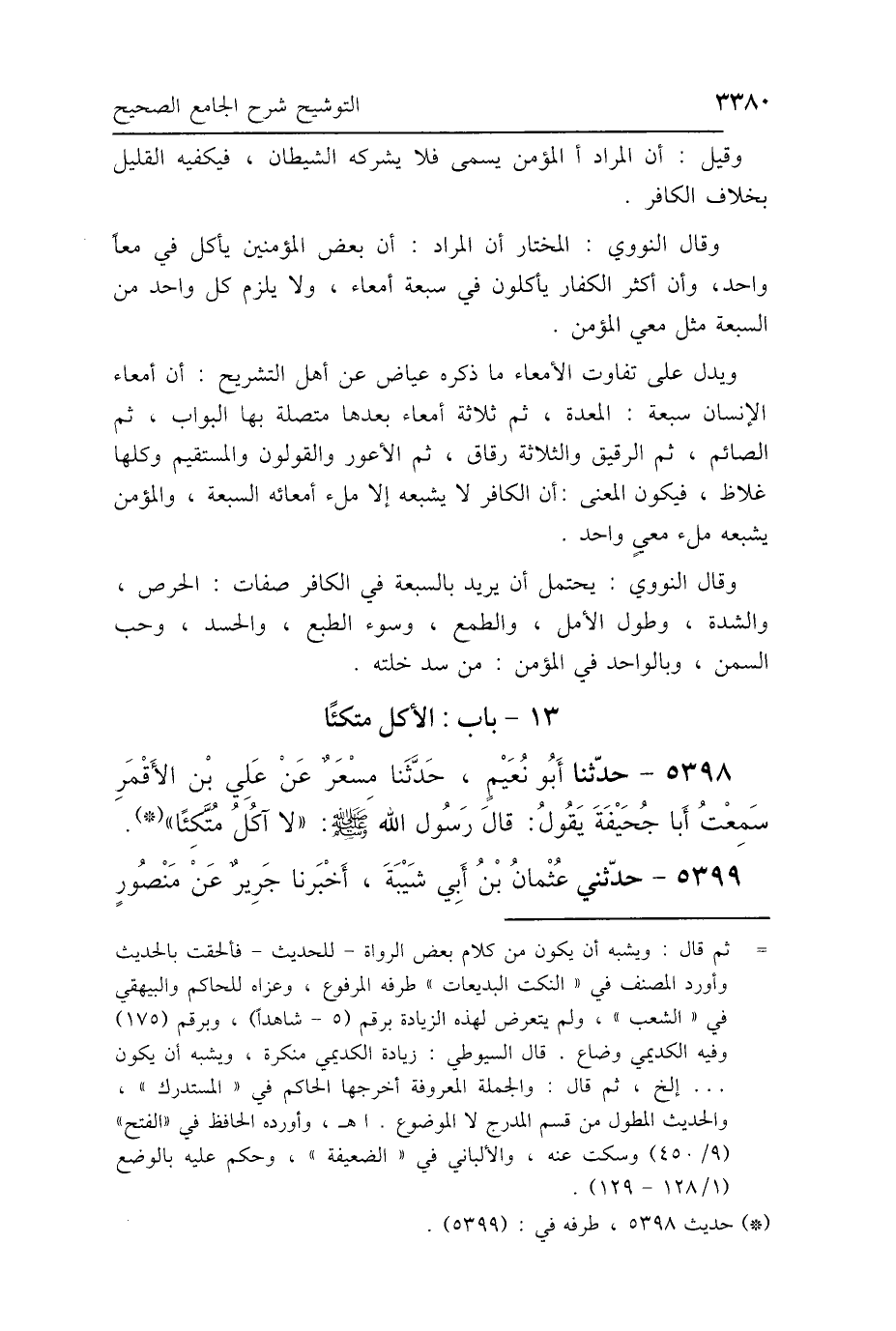 وقال النووي: المختار أن المراد: أن بعض المؤمنين يأكل في معًا واحد، وأن أكثر الكفار يأكلون في سبعة أمعاء، ولا يلزم كل واحد من السبعة مثل معي المؤمن.