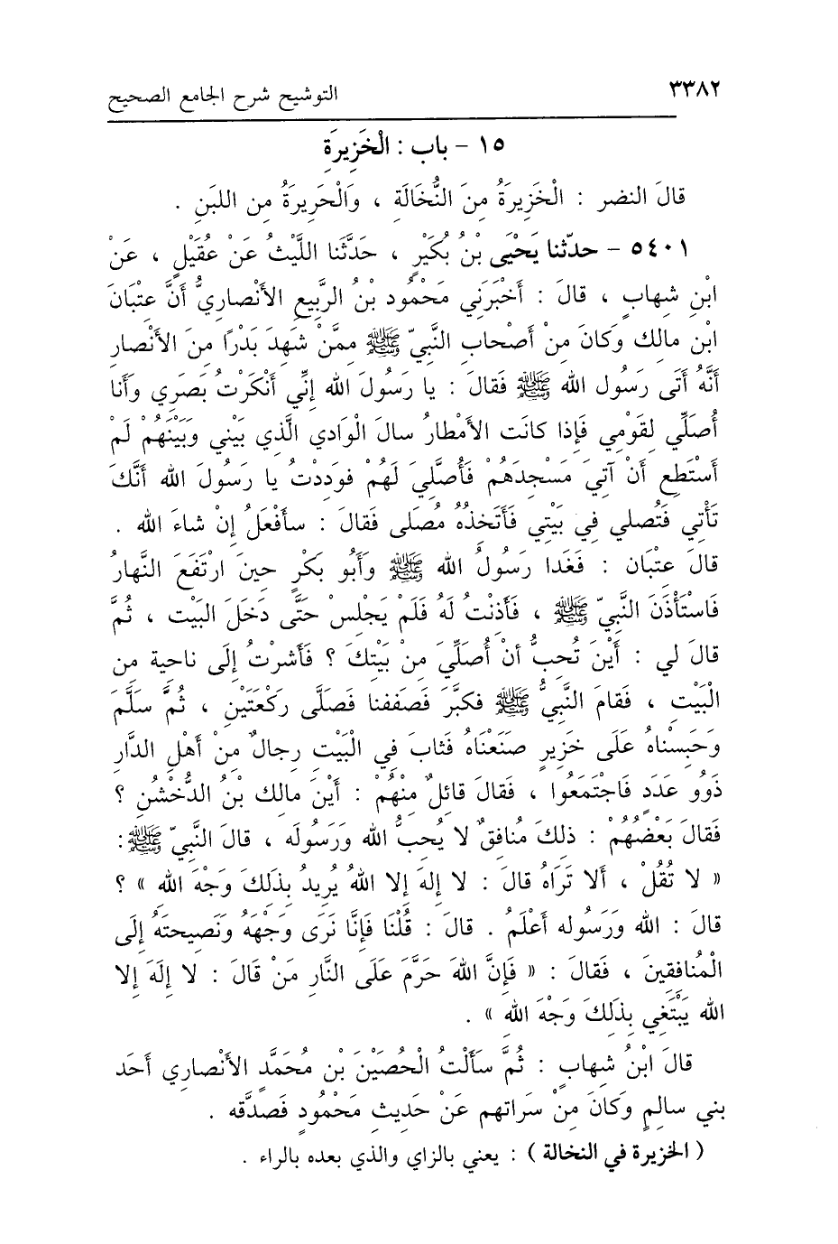 5401 - حَدَّثَنَا يَحْيَى بْنُ بُكَيْرٍ، حَدَّثَنَا اللَّيْثُ، عَنْ عُقَيْلٍ، عَنِ ابْنِ شِهَابٍ، قَالَ: أَخْبَرَنِي مَحْمُودُ بْنُ الرَّبِيعِ الأَنْصَارِيُّ، أَنَّ عِتْبَانَ بْنَ مَالِكٍ، وَكَانَ مِنْ أَصْحَابِ النَّبِيِّ صَلَّى اللهُ عَلَيْهِ وَسَلَّمَ مِمَّنْ شَهِدَ بَدْرًا مِنَ الأَنْصَارِ: أَنَّهُ أَتَى رَسُولَ اللَّهِ صَلَّى اللهُ عَلَيْهِ وَسَلَّمَ، فَقَالَ: يَا رَسُولَ اللَّهِ، إِنِّي أَنْكَرْتُ بَصَرِي، وَأَنَا أُصَلِّي لِقَوْمِي، فَإِذَا كَانَتِ الأَمْطَارُ سَالَ الوَادِي الَّذِي بَيْنِي وَبَيْنَهُمْ، لَمْ أَسْتَطِعْ أَنْ آتِيَ مَسْجِدَهُمْ فَأُصَلِّيَ لَهُمْ، فَوَدِدْتُ يَا رَسُولَ اللَّهِ، أَنَّكَ تَأْتِي فَتُصَلِّي فِي بَيْتِي فَأَتَّخِذُهُ مُصَلًّى، فَقَالَ: «سَأَفْعَلُ إِنْ شَاءَ اللَّهُ» قَالَ عِتْبَانُ: فَغَدَا رَسُولُ اللَّهِ صَلَّى اللهُ عَلَيْهِ وَسَلَّمَ وَأَبُو بَكْرٍ حِينَ ارْتَفَعَ النَّهَارُ، فَاسْتَأْذَنَ النَّبِيُّ صَلَّى اللهُ عَلَيْهِ وَسَلَّمَ فَأَذِنْتُ لَهُ، فَلَمْ يَجْلِسْ حَتَّى دَخَلَ البَيْتَ، ثُمَّ قَالَ لِي: «أَيْنَ تُحِبُّ أَنْ أُصَلِّيَ مِنْ بَيْتِكَ؟» فَأَشَرْتُ إِلَى نَاحِيَةٍ مِنَ البَيْتِ، فَقَامَ النَّبِيُّ صَلَّى اللهُ عَلَيْهِ وَسَلَّمَ فَكَبَّرَ فَصَفَفْنَا، فَصَلَّى رَكْعَتَيْنِ ثُمَّ سَلَّمَ، وَحَبَسْنَاهُ عَلَى خَزِيرٍ صَنَعْنَاهُ، فَثَابَ فِي البَيْتِ رِجَالٌ مِنْ أَهْلِ الدَّارِ ذَوُو عَدَدٍ فَاجْتَمَعُوا، فَقَالَ قَائِلٌ مِنْهُمْ: أَيْنَ مَالِكُ بْنُ الدُّخْشُنِ؟ فَقَالَ بَعْضُهُمْ: ذَلِكَ مُنَافِقٌ، لاَ يُحِبُّ اللَّهَ وَرَسُولَهُ، قَالَ النَّبِيُّ صَلَّى اللهُ عَلَيْهِ وَسَلَّمَ: " لاَ تَقُلْ، أَلاَ تَرَاهُ قَالَ: لاَ إِلَهَ إِلَّا اللَّهُ، يُرِيدُ بِذَلِكَ وَجْهَ اللَّهِ؟ " قَالَ: اللَّهُ وَرَسُولُهُ أَعْلَمُ، قَالَ: قُلْنَا: فَإِنَّا نَرَى وَجْهَهُ وَنَصِيحَتَهُ إِلَى المُنَافِقِينَ، فَقَالَ: " فَإِنَّ اللَّهَ حَرَّمَ عَلَى النَّارِ مَنْ قَالَ: لاَ إِلَهَ إِلَّا اللَّهُ، يَبْتَغِي بِذَلِكَ وَجْهَ اللَّهِ " قَالَ ابْنُ شِهَابٍ: ثُمَّ سَأَلْتُ الحُصَيْنَ بْنَ مُحَمَّدٍ الأَنْصَارِيَّ، أَحَدَ بَنِي سَالِمٍ، وَكَانَ مِنْ سَرَاتِهِمْ، عَنْ حَدِيثِ مَحْمُودٍ، فَصَدَّقَهُ.