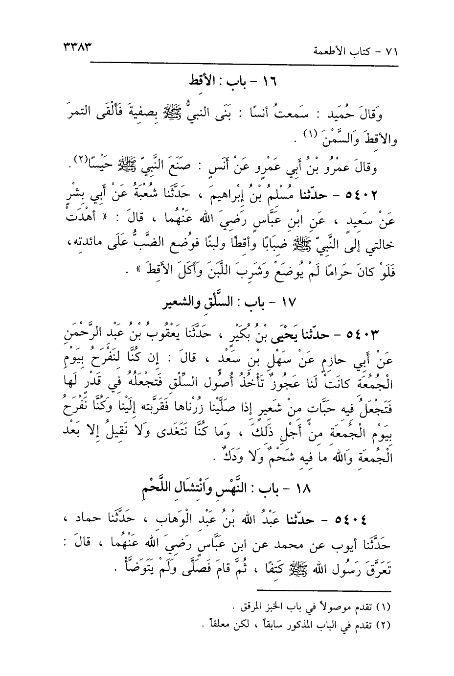 5404 - حَدَّثَنَا عَبْدُ اللَّهِ بْنُ عَبْدِ الوَهَّابِ، حَدَّثَنَا حَمَّادٌ، حَدَّثَنَا أَيُّوبُ، عَنْ مُحَمَّدٍ، عَنِ ابْنِ عَبَّاسٍ رَضِيَ اللَّهُ عَنْهُمَا، قَالَ: «تَعَرَّقَ رَسُولُ اللَّهِ صَلَّى اللهُ عَلَيْهِ وَسَلَّمَ كَتِفًا، ثُمَّ قَامَ فَصَلَّى وَلَمْ يَتَوَضَّأْ».