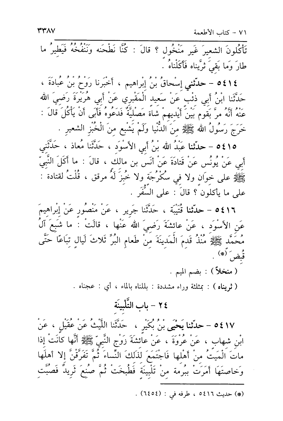 5414 - حَدَّثَنِي إِسْحَاقُ بْنُ إِبْرَاهِيمَ، أَخْبَرَنَا رَوْحُ بْنُ عُبَادَةَ، حَدَّثَنَا ابْنُ أَبِي ذِئْبٍ، عَنْ سَعِيدٍ المَقْبُرِيِّ، عَنْ أَبِي هُرَيْرَةَ رَضِيَ اللَّهُ عَنْهُ: أَنَّهُ مَرَّ بِقَوْمٍ بَيْنَ أَيْدِيهِمْ شَاةٌ مَصْلِيَّةٌ، فَدَعَوْهُ، فَأَبَى أَنْ يَأْكُلَ، وَقَالَ: «خَرَجَ رَسُولُ اللَّهِ صَلَّى اللهُ عَلَيْهِ وَسَلَّمَ مِنَ الدُّنْيَا وَلَمْ يَشْبَعْ مِنْ خُبْزِ الشَّعِيرِ».