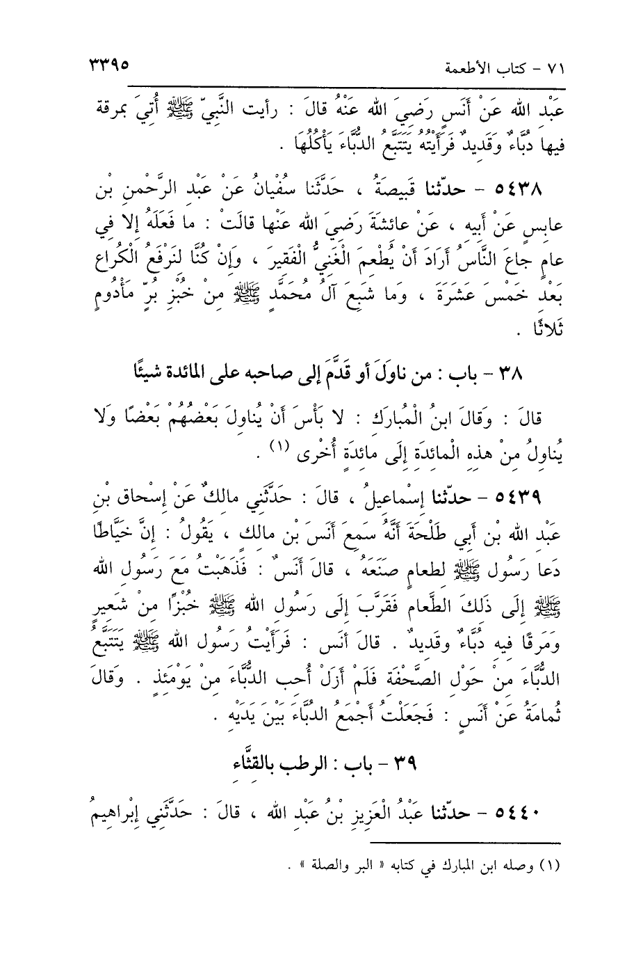 قَالَ: وَقَالَ ابْنُ المُبَارَكِ: «لاَ بَأْسَ أَنْ يُنَاوِلَ بَعْضُهُمْ بَعْضًا، وَلاَ يُنَاوِلُ مِنْ هَذِهِ المَائِدَةِ إِلَى مَائِدَةٍ أُخْرَى».