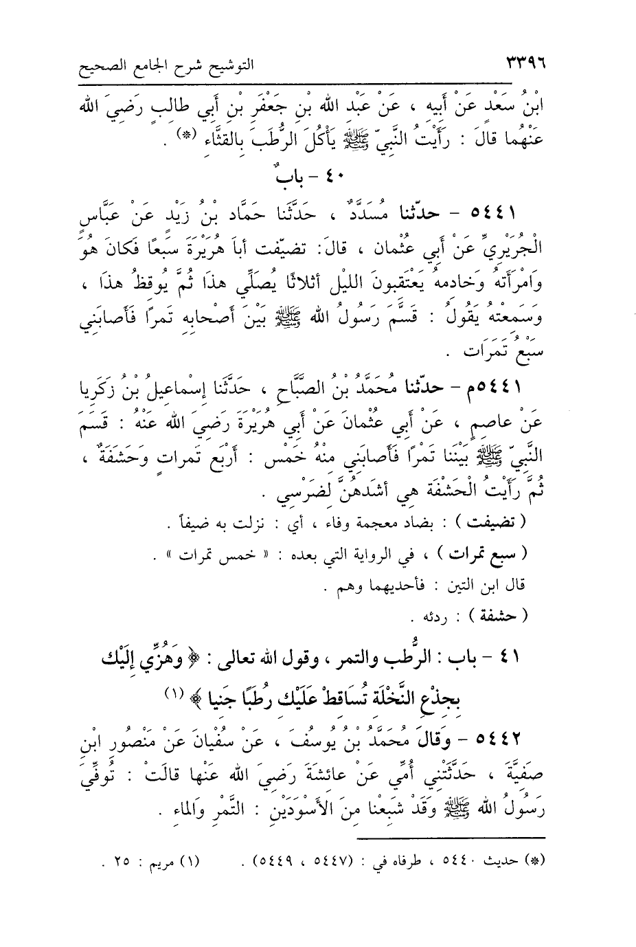 5441 - م- حَدَّثَنَا مُحَمَّدُ بْنُ الصَّبَّاحِ، حَدَّثَنَا إِسْمَاعِيلُ بْنُ زَكَرِيَّاءَ، عَنْ عَاصِمٍ، عَنْ أَبِي عُثْمَانَ، عَنْ أَبِي هُرَيْرَةَ رَضِيَ اللَّهُ عَنْهُ: " قَسَمَ النَّبِيُّ صَلَّى اللهُ عَلَيْهِ وَسَلَّمَ بَيْنَنَا تَمْرًا، فَأَصَابَنِي مِنْهُ خَمْسٌ: أَرْبَعُ تَمَرَاتٍ وَحَشَفَةٌ، ثُمَّ رَأَيْتُ الحَشَفَةَ هِيَ أَشَدُّهُنَّ لِضِرْسِي.