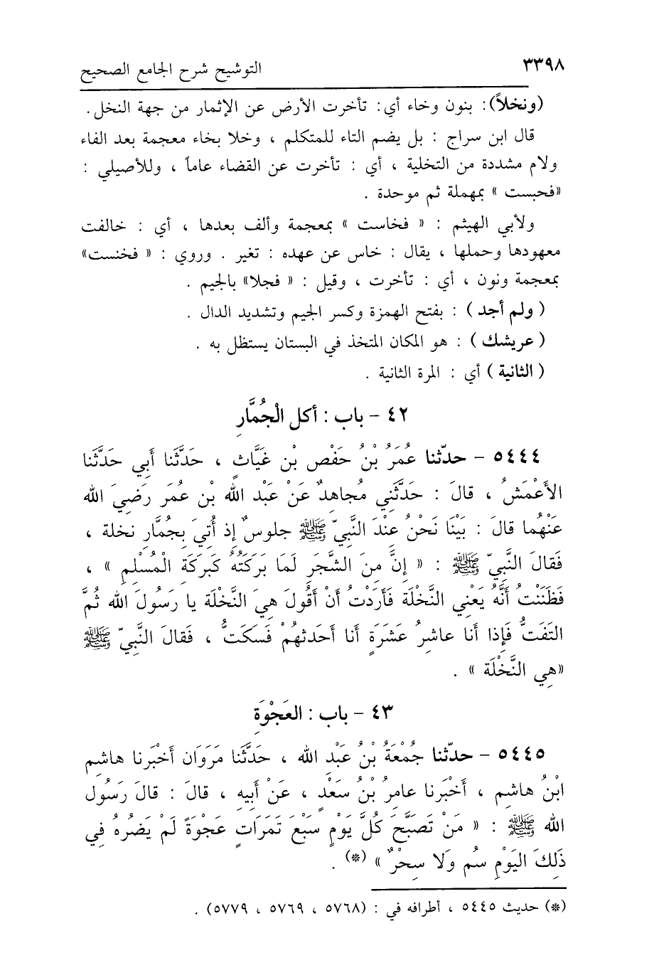 قال ابن سراج: بل يضم التاء للمتكلم، وخلا بخاء معجمة بعد الفاء ولام مشددة من التخلية، أي: تأخرت عن القضاء عامًا، وللأصيلي: "فحبست" بمهملة ثم موحدة.