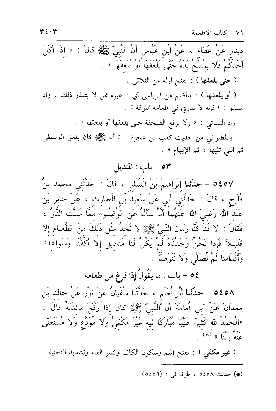 دِينَارٍ، عَنْ عَطَاءٍ، عَنِ ابْنِ عَبَّاسٍ: أَنَّ النَّبِيَّ صَلَّى اللهُ عَلَيْهِ وَسَلَّمَ قَالَ: «إِذَا أَكَلَ أَحَدُكُمْ فَلاَ يَمْسَحْ يَدَهُ حَتَّى يَلْعَقَهَا أَوْ يُلْعِقَهَا».