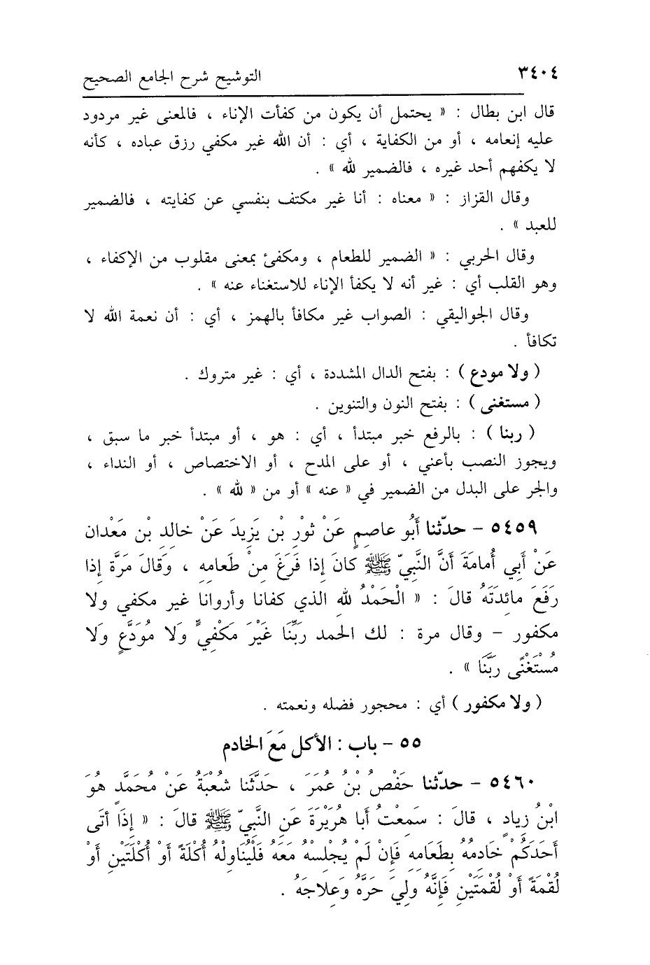 قال ابن بطال: "يحتمل أن يكون من كفأت الإناء، فالمعنى غير مردود عليه إنعامه، أو من الكفاية، أي: أن الله غير مكفى رزق عباده، كأنه لا يكفهم أحد غيره، فالضمير لله".