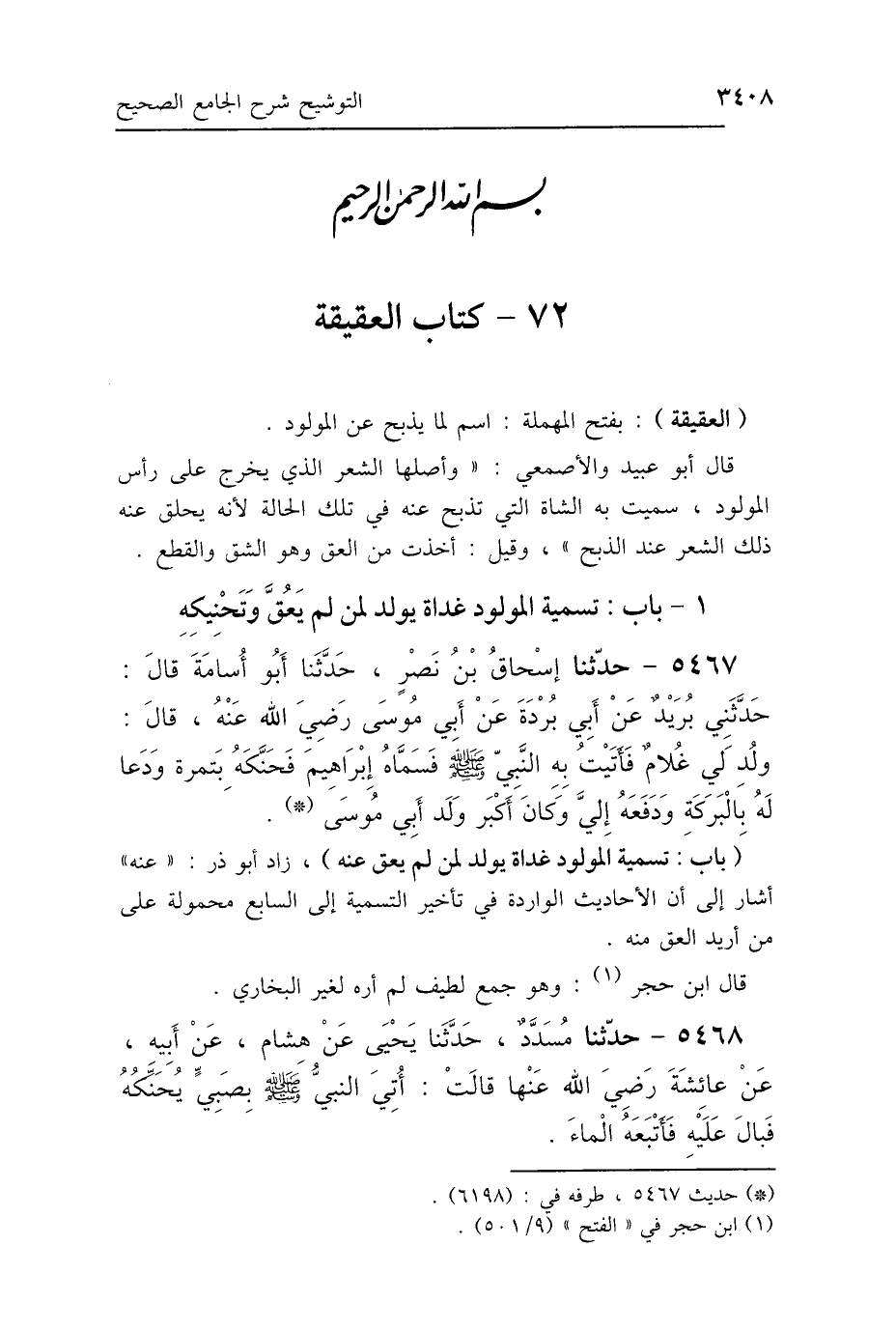 (باب: تسمية المولود غداة يولد لمن لم يعق عنه)، زاد أبو ذر: "عنه" أشار إلى أن الأحاديث الواردة في تأخير التسمية إلى السابع محمولة على من أريد العق منه.