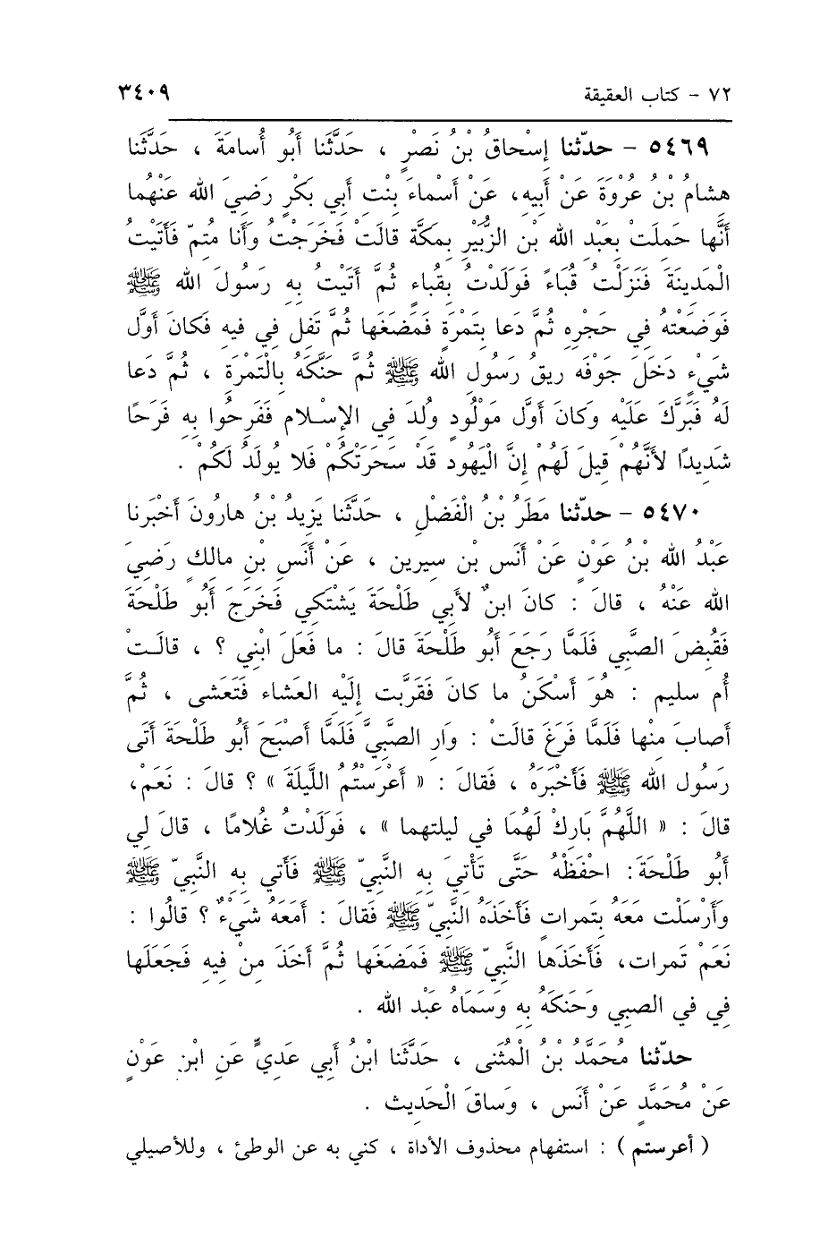 5470 - حَدَّثَنَا مَطَرُ بْنُ الفَضْلِ، حَدَّثَنَا يَزِيدُ بْنُ هَارُونَ، أَخْبَرَنَا عَبْدُ اللَّهِ بْنُ عَوْنٍ، عَنْ أَنَسِ بْنِ سِيرِينَ، عَنْ أَنَسِ بْنِ مَالِكٍ رَضِيَ اللَّهُ عَنْهُ، قَالَ: كَانَ ابْنٌ لِأَبِي طَلْحَةَ يَشْتَكِي، فَخَرَجَ أَبُو طَلْحَةَ، فَقُبِضَ الصَّبِيُّ، فَلَمَّا رَجَعَ أَبُو طَلْحَةَ، قَالَ: مَا فَعَلَ ابْنِي، قَالَتْ أُمُّ سُلَيْمٍ: هُوَ أَسْكَنُ مَا كَانَ، فَقَرَّبَتْ إِلَيْهِ العَشَاءَ فَتَعَشَّى، ثُمَّ أَصَابَ مِنْهَا، فَلَمَّا فَرَغَ قَالَتْ: وَارُوا الصَّبِيَّ، فَلَمَّا أَصْبَحَ أَبُو طَلْحَةَ أَتَى رَسُولَ اللَّهِ صَلَّى اللهُ عَلَيْهِ وَسَلَّمَ فَأَخْبَرَهُ، فَقَالَ: «أَعْرَسْتُمُ اللَّيْلَةَ؟» قَالَ: نَعَمْ، قَالَ: «اللَّهُمَّ بَارِكْ لَهُمَا» فَوَلَدَتْ غُلاَمًا، قَالَ لِي أَبُو طَلْحَةَ: احْفَظْهُ حَتَّى تَأْتِيَ بِهِ النَّبِيَّ صَلَّى اللهُ عَلَيْهِ وَسَلَّمَ، فَأَتَى بِهِ النَّبِيَّ صَلَّى اللهُ عَلَيْهِ وَسَلَّمَ وَأَرْسَلَتْ مَعَهُ بِتَمَرَاتٍ، فَأَخَذَهُ النَّبِيُّ صَلَّى اللهُ عَلَيْهِ وَسَلَّمَ فَقَالَ: «أَمَعَهُ شَيْءٌ؟» قَالُوا: نَعَمْ، تَمَرَاتٌ، فَأَخَذَهَا النَّبِيُّ صَلَّى اللهُ عَلَيْهِ وَسَلَّمَ فَمَضَغَهَا، ثُمَّ أَخَذَ مِنْ فِيهِ، فَجَعَلَهَا فِي فِي الصَّبِيِّ وَحَنَّكَهُ بِهِ، وَسَمَّاهُ عَبْدَ اللَّهِ حَدَّثَنَا مُحَمَّدُ بْنُ المُثَنَّى، حَدَّثَنَا ابْنُ أَبِي عَدِيٍّ، عَنْ ابْنِ عَوْنٍ، عَنْ مُحَمَّدٍ، عَنْ أَنَسٍ، وَسَاقَ الحَدِيثَ.