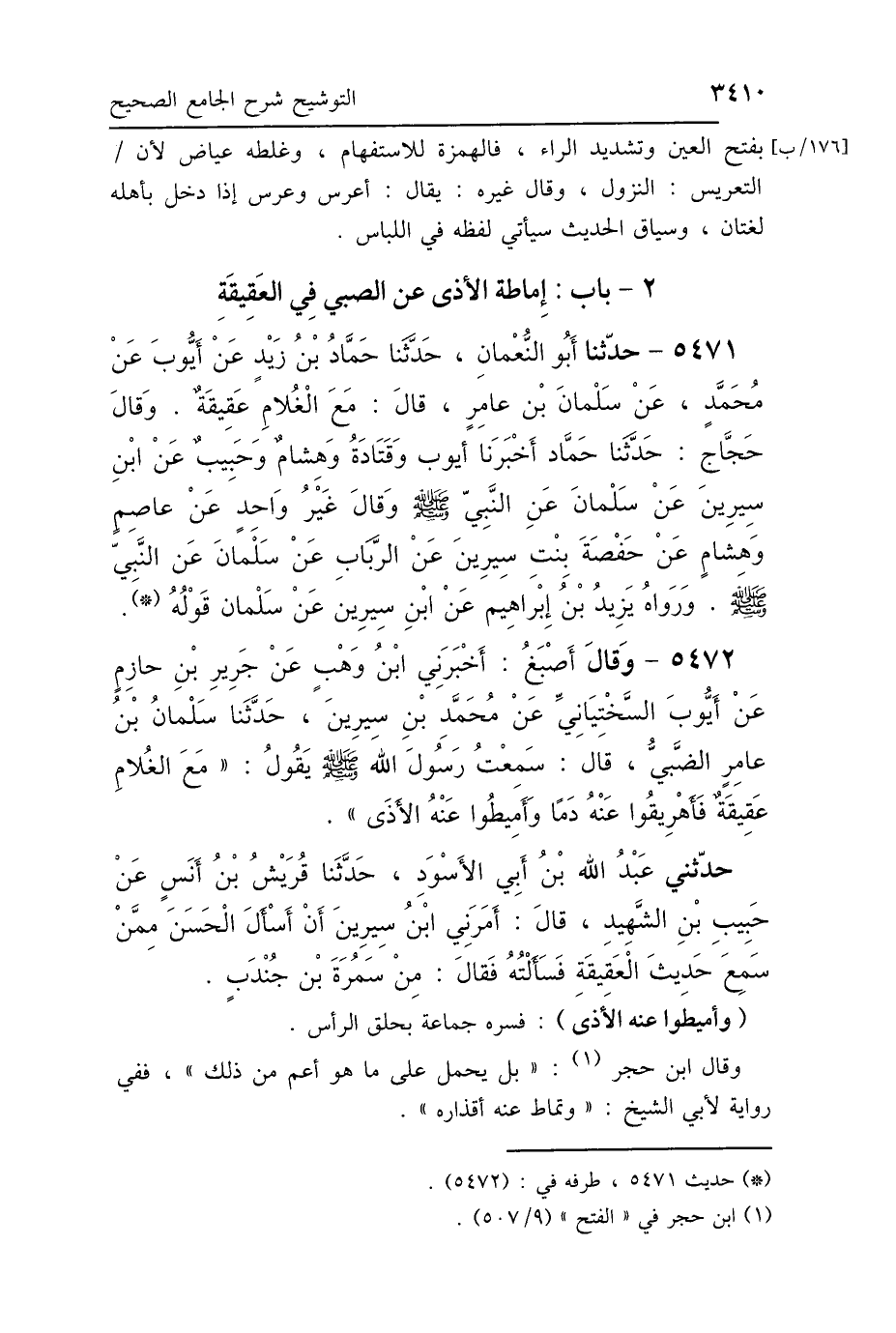 5471 - حَدَّثَنَا أَبُو النُّعْمَانِ، حَدَّثَنَا حَمَّادُ بْنُ زَيْدٍ، عَنْ أَيُّوبَ، عَنْ مُحَمَّدٍ، عَنْ سَلْمَانَ بْنِ عَامِرٍ، قَالَ: «مَعَ الغُلاَمِ عَقِيقَةٌ» وَقَالَ حَجَّاجٌ، حَدَّثَنَا حَمَّادٌ، أَخْبَرَنَا أَيُّوبُ، وَقَتَادَةُ، وَهِشَامٌ، وَحَبِيبٌ، عَنْ ابْنِ سِيرِينَ، عَنْ سَلْمَانَ، عَنِ النَّبِيِّ صَلَّى اللهُ عَلَيْهِ وَسَلَّمَ، وَقَالَ غَيْرُ وَاحِدٍ، عَنْ عَاصِمٍ، وَهِشَامٍ، عَنْ حَفْصَةَ بِنْتِ سِيرِينَ، عَنِ الرَّبَابِ، عَنْ سَلْمَانَ بْنِ عَامِرٍ الضَّبِّيِّ، عَنِ النَّبِيِّ صَلَّى اللهُ عَلَيْهِ وَسَلَّمَ، وَرَوَاهُ يَزِيدُ بْنُ إِبْرَاهِيمَ، عَنْ ابْنِ سِيرِينَ، عَنْ سَلْمَانَ قَوْلَهُ.