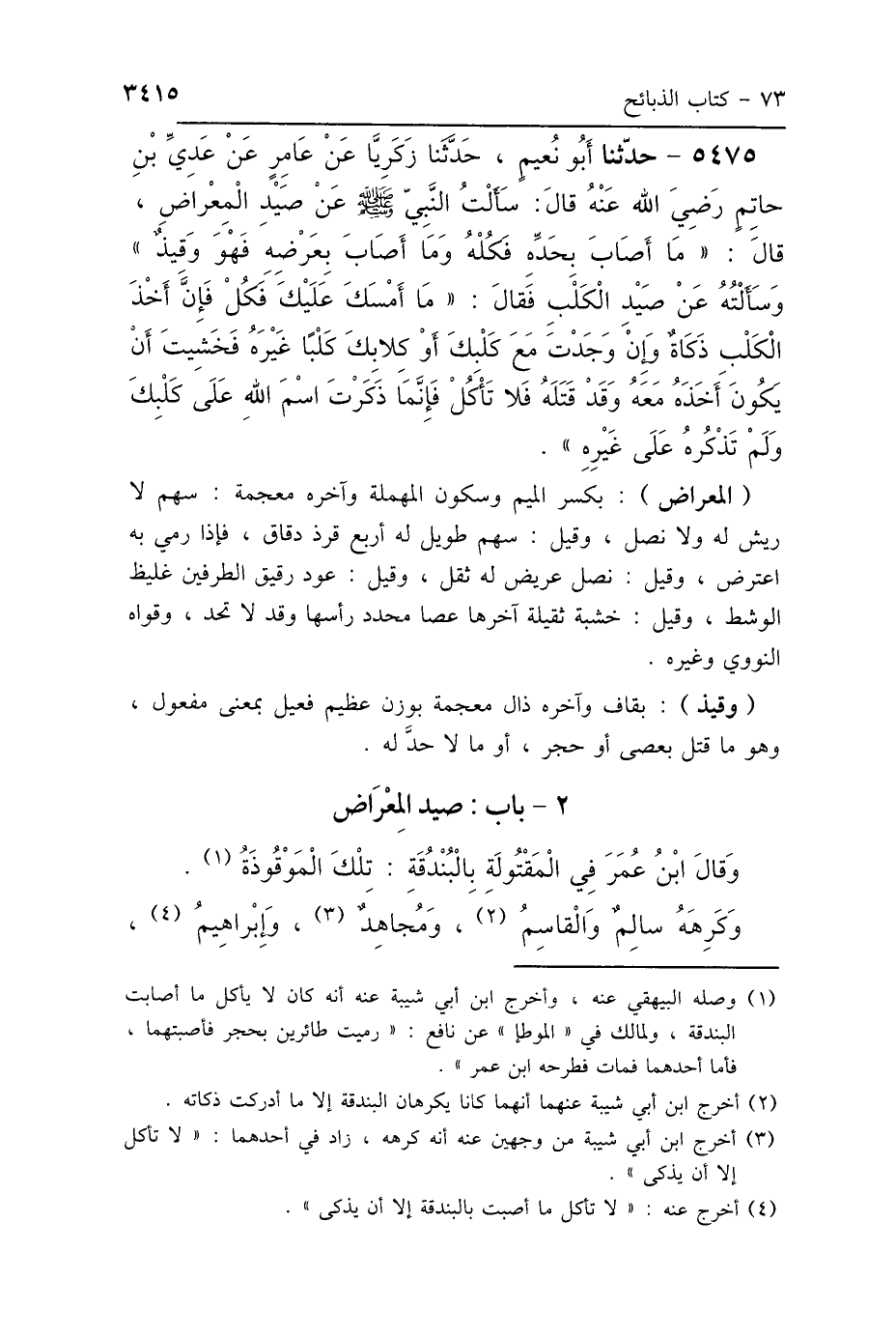 5475 - حَدَّثَنَا أَبُو نُعَيْمٍ، حَدَّثَنَا زَكَرِيَّاءُ، عَنْ عَامِرٍ، عَنْ عَدِيِّ بْنِ حَاتِمٍ رَضِيَ اللَّهُ عَنْهُ، قَالَ: سَأَلْتُ النَّبِيَّ صَلَّى اللهُ عَلَيْهِ وَسَلَّمَ عَنْ صَيْدِ المِعْرَاضِ، قَالَ: «مَا أَصَابَ بِحَدِّهِ فَكُلْهُ، وَمَا أَصَابَ بِعَرْضِهِ فَهُوَ وَقِيذٌ» وَسَأَلْتُهُ عَنْ صَيْدِ الكَلْبِ، فَقَالَ: «مَا أَمْسَكَ عَلَيْكَ فَكُلْ، فَإِنَّ أَخْذَ الكَلْبِ ذَكَاةٌ، وَإِنْ وَجَدْتَ مَعَ كَلْبِكَ أَوْ كِلاَبِكَ كَلْبًا غَيْرَهُ، فَخَشِيتَ أَنْ يَكُونَ أَخَذَهُ مَعَهُ، وَقَدْ قَتَلَهُ فَلاَ تَأْكُلْ، فَإِنَّمَا ذَكَرْتَ اسْمَ اللَّهِ عَلَى كَلْبِكَ وَلَمْ تَذْكُرْهُ عَلَى غَيْرِهِ».