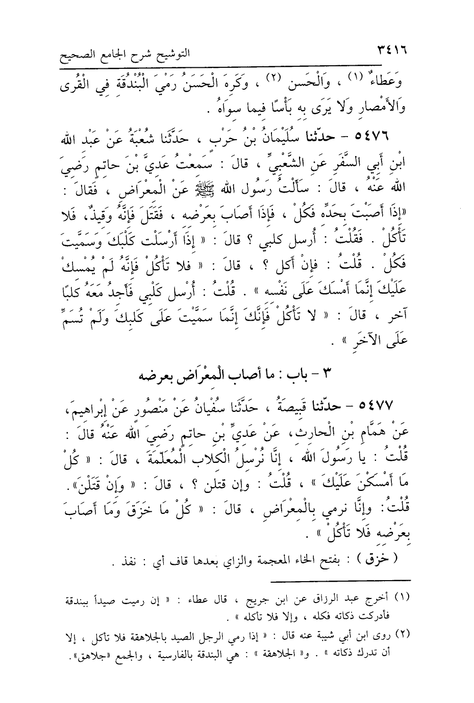5476 - حَدَّثَنَا سُلَيْمَانُ بْنُ حَرْبٍ، حَدَّثَنَا شُعْبَةُ، عَنْ عَبْدِ اللَّهِ بْنِ أَبِي السَّفَرِ، عَنِ الشَّعْبِيِّ، قَالَ: سَمِعْتُ عَدِيَّ بْنَ حَاتِمٍ رَضِيَ اللَّهُ عَنْهُ، قَالَ: سَأَلْتُ رَسُولَ اللَّهِ صَلَّى اللهُ عَلَيْهِ وَسَلَّمَ عَنِ المِعْرَاضِ، فَقَالَ: «إِذَا أَصَبْتَ بِحَدِّهِ فَكُلْ، فَإِذَا أَصَابَ بِعَرْضِهِ فَقَتَلَ فَإِنَّهُ وَقِيذٌ فَلاَ تَأْكُلْ» فَقُلْتُ: أُرْسِلُ كَلْبِي؟ قَالَ: «إِذَا أَرْسَلْتَ كَلْبَكَ وَسَمَّيْتَ فَكُلْ» قُلْتُ: فَإِنْ أَكَلَ؟ قَالَ: «فَلاَ تَأْكُلْ، فَإِنَّهُ لَمْ يُمْسِكْ عَلَيْكَ، إِنَّمَا أَمْسَكَ عَلَى نَفْسِهِ» قُلْتُ: أُرْسِلُ كَلْبِي فَأَجِدُ مَعَهُ كَلْبًا آخَرَ؟ قَالَ: «لاَ تَأْكُلْ، فَإِنَّكَ إِنَّمَا سَمَّيْتَ عَلَى كَلْبِكَ وَلَمْ تُسَمِّ عَلَى آخَرَ».
