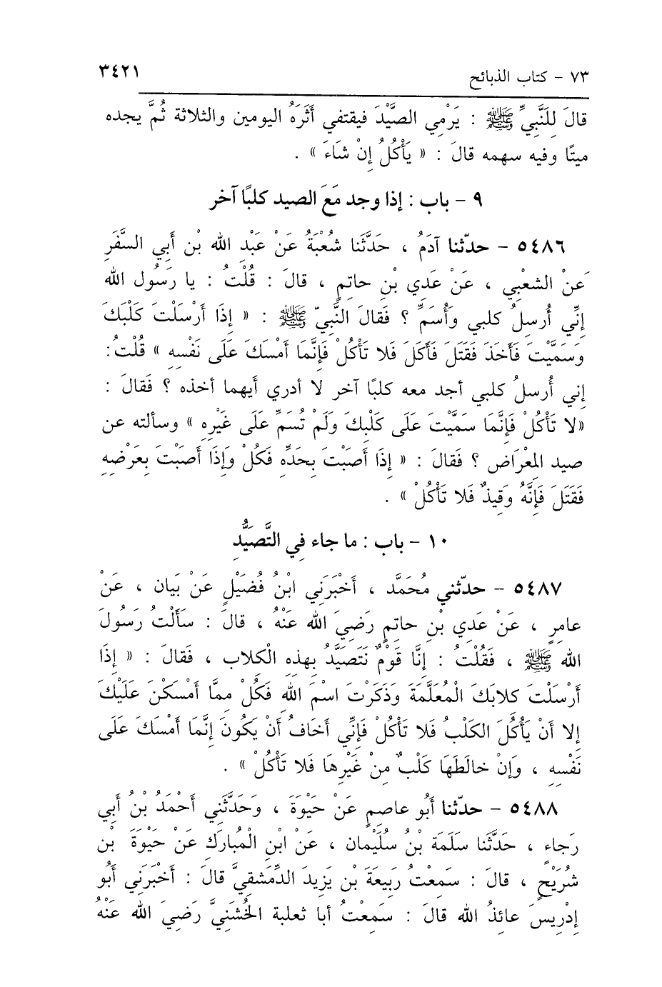 5486 - حَدَّثَنَا آدَمُ، حَدَّثَنَا شُعْبَةُ، عَنْ عَبْدِ اللَّهِ بْنِ أَبِي السَّفَرِ، عَنِ الشَّعْبِيِّ، عَنْ عَدِيِّ بْنِ حَاتِمٍ، قَالَ: قُلْتُ: يَا رَسُولَ اللَّهِ، إِنِّي أُرْسِلُ كَلْبِي وَأُسَمِّي، فَقَالَ النَّبِيُّ صَلَّى اللهُ عَلَيْهِ وَسَلَّمَ: «إِذَا أَرْسَلْتَ كَلْبَكَ وَسَمَّيْتَ، فَأَخَذَ فَقَتَلَ فَأَكَلَ فَلاَ تَأْكُلْ، فَإِنَّمَا أَمْسَكَ عَلَى نَفْسِهِ» قُلْتُ: إِنِّي أُرْسِلُ كَلْبِي، أَجِدُ مَعَهُ كَلْبًا آخَرَ، لاَ أَدْرِي أَيُّهُمَا أَخَذَهُ؟ فَقَالَ: «لاَ تَأْكُلْ، فَإِنَّمَا سَمَّيْتَ عَلَى كَلْبِكَ وَلَمْ تُسَمِّ عَلَى غَيْرِهِ»