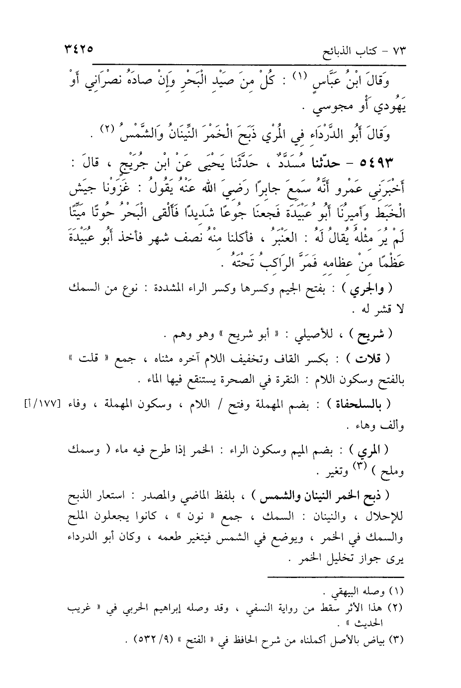وَقَالَ ابْنُ عَبَّاسٍ: «كُلْ مِنْ صَيْدِ البَحْرِ نَصْرَانِيٍّ أَوْ يَهُودِيٍّ أَوْ مَجُوسِيٍّ» وَقَالَ أَبُوالدَّرْدَاءِ، فِي المُرِي: «ذَبَحَ الخَمْرَ النِّينَانُ وَالشَّمْسُ».