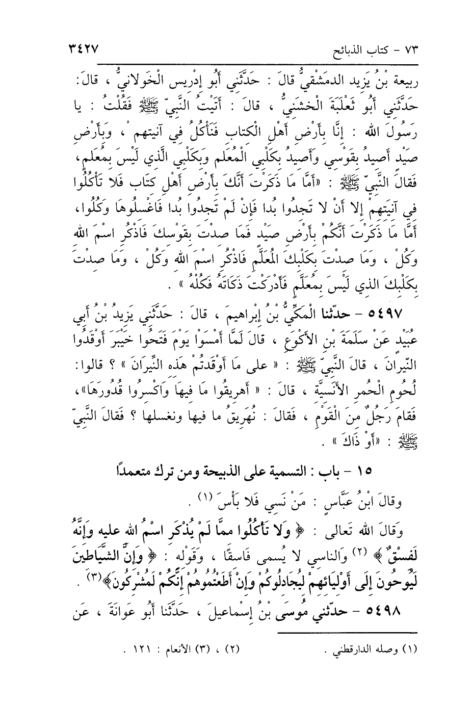رَبِيعَةُ بْنُ يَزِيدَ الدِّمَشْقِيُّ، قَالَ: حَدَّثَنِي أَبُو إِدْرِيسَ الخَوْلاَنِيُّ، قَالَ: حَدَّثَنِي أَبُو ثَعْلَبَةَ الخُشَنِيُّ، قَالَ: أَتَيْتُ النَّبِيَّ صَلَّى اللهُ عَلَيْهِ وَسَلَّمَ، فَقُلْتُ: يَا رَسُولَ اللَّهِ، إِنَّا بِأَرْضِ أَهْلِ الكِتَابِ، فَنَأْكُلُ فِي آنِيَتِهِمْ، وَبِأَرْضِ صَيْدٍ، أَصِيدُ بِقَوْسِي، وَأَصِيدُ بِكَلْبِي المُعَلَّمِ وَبِكَلْبِي الَّذِي لَيْسَ بِمُعَلَّمٍ؟ فَقَالَ النَّبِيُّ صَلَّى اللهُ عَلَيْهِ وَسَلَّمَ: " أَمَّا مَا ذَكَرْتَ أَنَّكَ بِأَرْضِ أَهْلِ كِتَابٍ: فَلاَ تَأْكُلُوا فِي آنِيَتِهِمْ إِلَّا أَنْ لاَ تَجِدُوا بُدًّا، فَإِنْ لَمْ تَجِدُوا بُدًّا فَاغْسِلُوهَا وَكُلُوا، وَأَمَّا مَا ذَكَرْتَ أَنَّكُمْ بِأَرْضِ صَيْدٍ: فَمَا صِدْتَ بِقَوْسِكَ فَاذْكُرِ اسْمَ اللَّهِ وَكُلْ، وَمَا صِدْتَ بِكَلْبِكَ المُعَلَّمِ فَاذْكُرِ اسْمَ اللَّهِ وَكُلْ، وَمَا صِدْتَ بِكَلْبِكَ الَّذِي لَيْسَ بِمُعَلَّمٍ فَأَدْرَكْتَ ذَكَاتَهُ فَكُلْهُ".
