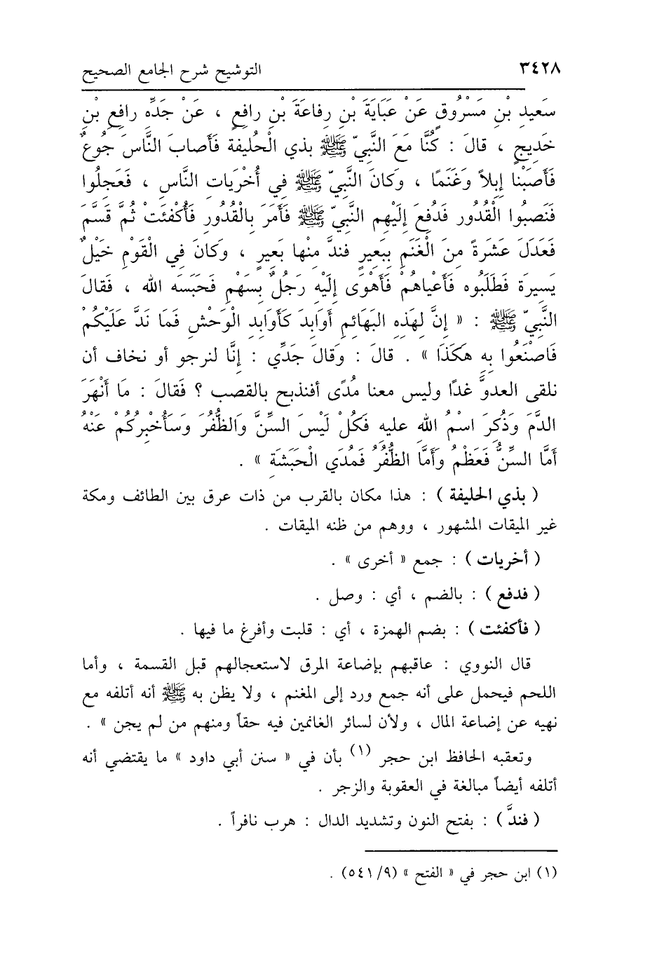 سَعِيدِ بْنِ مَسْرُوقٍ، عَنْ عَبَايَةَ بْنِ رِفَاعَةَ بْنِ رَافِعٍ، عَنْ جَدِّهِ رَافِعِ بْنِ خَدِيجٍ، قَالَ: كُنَّا مَعَ النَّبِيِّ صَلَّى اللهُ عَلَيْهِ وَسَلَّمَ بِذِي الحُلَيْفَةِ، فَأَصَابَ النَّاسَ جُوعٌ، فَأَصَبْنَا إِبِلًا وَغَنَمًا، وَكَانَ النَّبِيُّ صَلَّى اللهُ عَلَيْهِ وَسَلَّمَ فِي أُخْرَيَاتِ النَّاسِ، فَعَجِلُوا فَنَصَبُوا القُدُورَ، فَدُفِعَ إِلَيْهِمُ النَّبِيُّ صَلَّى اللهُ عَلَيْهِ وَسَلَّمَ فَأَمَرَ بِالقُدُورِ فَأُكْفِئَتْ، ثُمَّ قَسَمَ فَعَدَلَ عَشَرَةً مِنَ الغَنَمِ بِبَعِيرٍ، فَنَدَّ مِنْهَا بَعِيرٌ، وَكَانَ فِي القَوْمِ خَيْلٌ يَسِيرَةٌ، فَطَلَبُوهُ فَأَعْيَاهُمْ، فَأَهْوَى إِلَيْهِ رَجُلٌ بِسَهْمٍ فَحَبَسَهُ اللَّهُ، فَقَالَ النَّبِيُّ صَلَّى اللهُ عَلَيْهِ وَسَلَّمَ: «إِنَّ لِهَذِهِ البَهَائِمِ أَوَابِدَ كَأَوَابِدِ الوَحْشِ، فَمَا نَدَّ عَلَيْكُمْ مِنْهَا فَاصْنَعُوا بِهِ هَكَذَا» قَالَ: وَقَالَ جَدِّي: إِنَّا لَنَرْجُو، أَوْ نَخَافُ، أَنْ نَلْقَى العَدُوَّ غَدًا، وَلَيْسَ مَعَنَا مُدًى، أَفَنَذْبَحُ بِالقَصَبِ؟ فَقَالَ: "مَا أَنْهَرَ الدَّمَ وَذُكِرَ اسْمُ اللَّهِ عَلَيْهِ فَكُلْ، لَيْسَ السِّنَّ وَالظُّفُرَ، وَسَأُخْبِرُكُمْ عَنْهُ: أَمَّا السِّنُّ فَعَظْمٌ، وَأَمَّا الظُّفُرُ فَمُدَى الحَبَشَةِ".