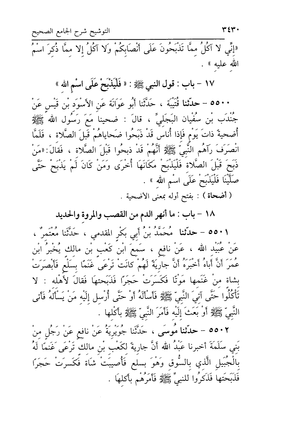 5500 - حَدَّثَنَا قُتَيْبَةُ، حَدَّثَنَا أَبُو عَوَانَةَ، عَنِ الأَسْوَدِ بْنِ قَيْسٍ، عَنْ جُنْدَبِ بْنِ سُفْيَانَ البَجَلِيِّ، قَالَ: ضَحَّيْنَا مَعَ رَسُولِ اللَّهِ صَلَّى اللهُ عَلَيْهِ وَسَلَّمَ أُضْحِيَةً ذَاتَ يَوْمٍ، فَإِذَا أُنَاسٌ قَدْ ذَبَحُوا ضَحَايَاهُمْ قَبْلَ الصَّلاَةِ، فَلَمَّا انْصَرَفَ، رَآهُمُ النَّبِيُّ صَلَّى اللهُ عَلَيْهِ وَسَلَّمَ أَنَّهُمْ قَدْ ذَبَحُوا قَبْلَ الصَّلاَةِ، فَقَالَ: «مَنْ ذَبَحَ قَبْلَ الصَّلاَةِ فَلْيَذْبَحْ مَكَانَهَا أُخْرَى، وَمَنْ كَانَ لَمْ يَذْبَحْ حَتَّى صَلَّيْنَا فَلْيَذْبَحْ عَلَى اسْمِ اللَّهِ».