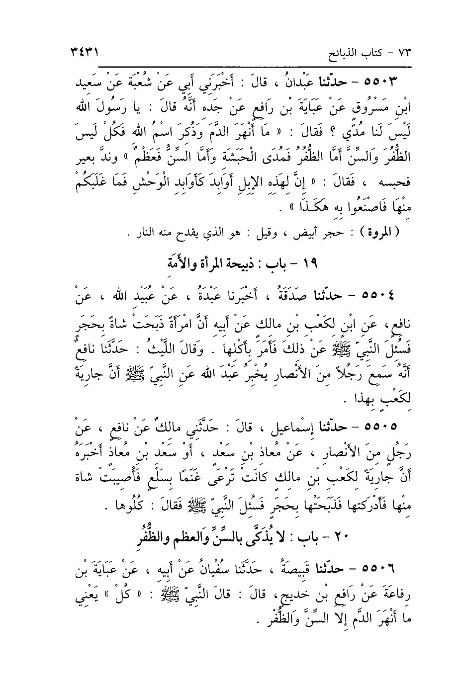 5504 - حَدَّثَنَا صَدَقَةُ، أَخْبَرَنَا عَبْدَةُ، عَنْ عُبَيْدِ اللَّهِ، عَنْ نَافِعٍ، عَنِ ابْنِ كَعْبِ بْنِ مَالِكٍ، عَنْ أَبِيهِ: أَنَّ امْرَأَةً ذَبَحَتْ شَاةً بِحَجَرٍ، «فَسُئِلَ النَّبِيُّ صَلَّى اللهُ عَلَيْهِ وَسَلَّمَ عَنْ ذَلِكَ فَأَمَرَ بِأَكْلِهَا» وَقَالَ اللَّيْثُ: حَدَّثَنَا نَافِعٌ، أَنَّهُ سَمِعَ رَجُلًا، مِنَ الأَنْصَارِ: يُخْبِرُ عَبْدَ اللَّهِ، عَنِ النَّبِيِّ صَلَّى اللهُ عَلَيْهِ وَسَلَّمَ: أَنَّ جَارِيَةً لِكَعْبٍ: بِهَذَا.