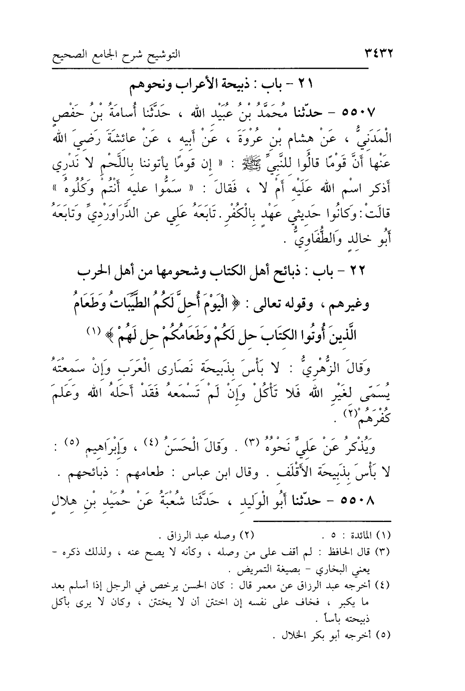 22 - بَابُ ذَبَائِحِ أَهْلِ الكِتَابِ وَشُحُومِهَا، مِنْ أَهْلِ الحَرْبِ وَغَيْرِهِمْ وَقَوْلِهِ تَعَالَى: {اليَوْمَ أُحِلَّ لَكُمُ الطَّيِّبَاتُ وَطَعَامُ الَّذِينَ أُوتُوا الكِتَابَ حِلٌّ لَكُمْ وَطَعَامُكُمْ حِلٌّ لَهُمْ} [المائدة: 5]
